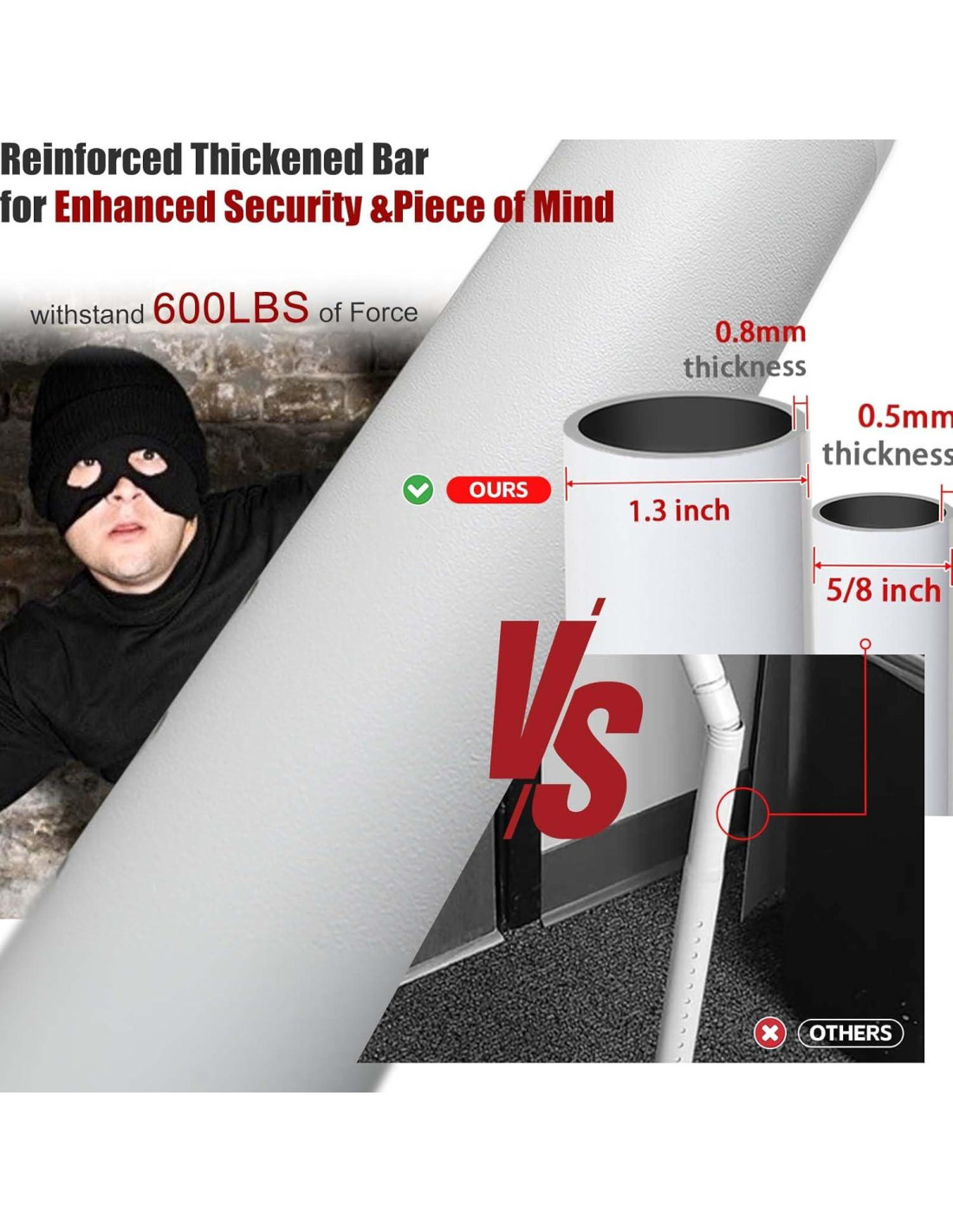 - Reforzada para Mantenerte a Ti y a Tus Seres Queridos a Salvo: Nuestra barra de seguridad para puertas de alta resistencia de 1.3 pulgadas (3.3 cm) soporta hasta 600 lbs (272.2 kg) de fuerza sin doblarse ni romperse, superando con creces las barras de 1 pulgada (2.5 cm) y 5/8 pulgadas (1.6 cm). Diseñada para resistir incluso las patadas y los intentos de palanca más fuertes, brindándote tranquilidad ya sea que estés solo en casa, con niños o alojándote en un hotel. Duerme tranquilo, ¡ningún intruso pasará!