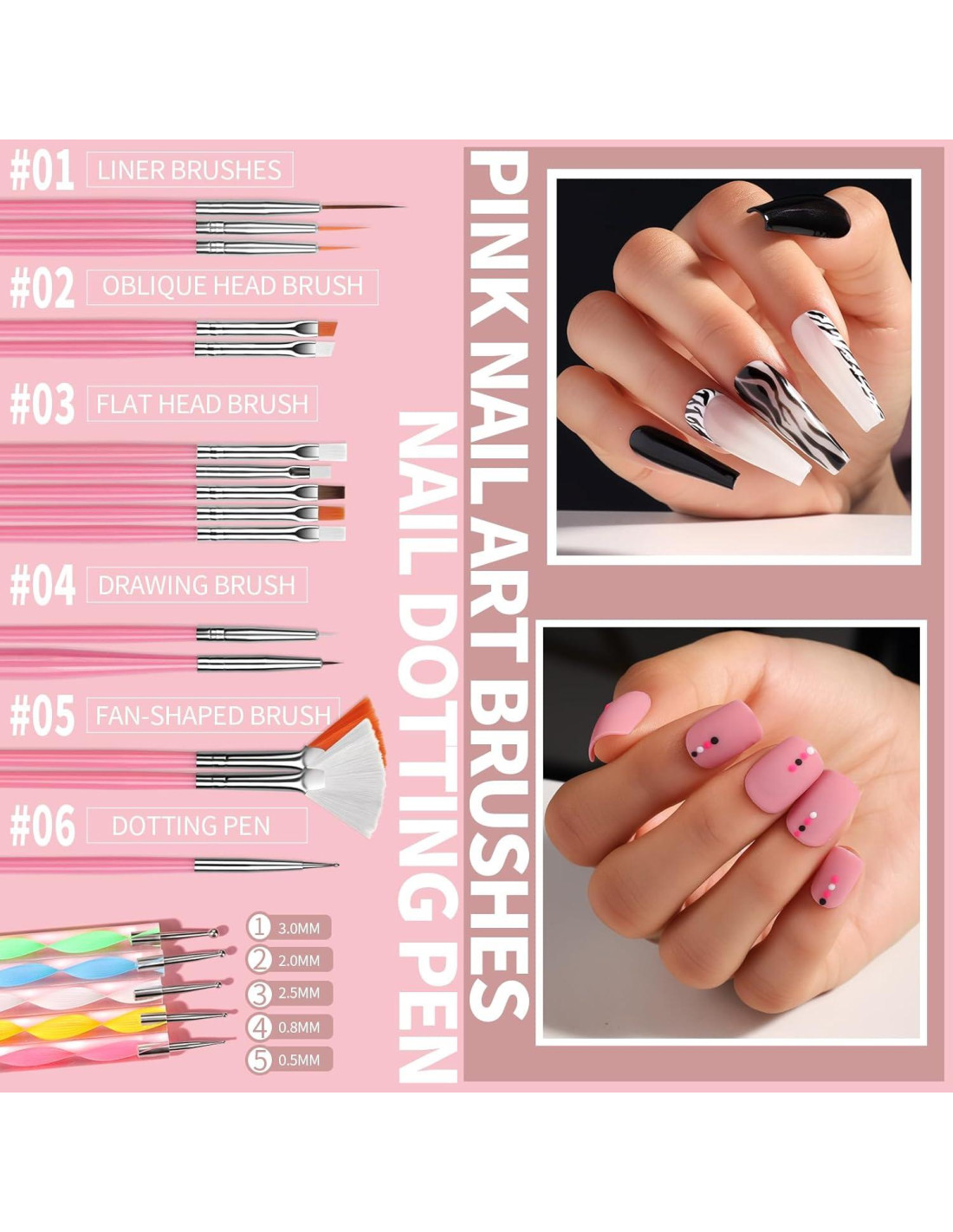 - Kit de Herramientas para Diseño de Uñas: 15 pinceles para arte de uñas incluyen pinceles de cabeza plana, pinceles de cabeza oblicua, pinceles de dibujo, pinceles de línea, pinceles en forma de abanico y pincel de punteado para dibujar líneas, olas, animales, flores, hojas y todas las formas y patrones que desees. Punteando piedras brillantes y otras decoraciones para uñas. Barriendo el exceso de polvos de brillo. 5 bolígrafos de punteado para uñas tienen la misma bola de tamaño en un extremo y diferentes tamaños en el otro para punteado y pintura de varios tamaños y patrones.