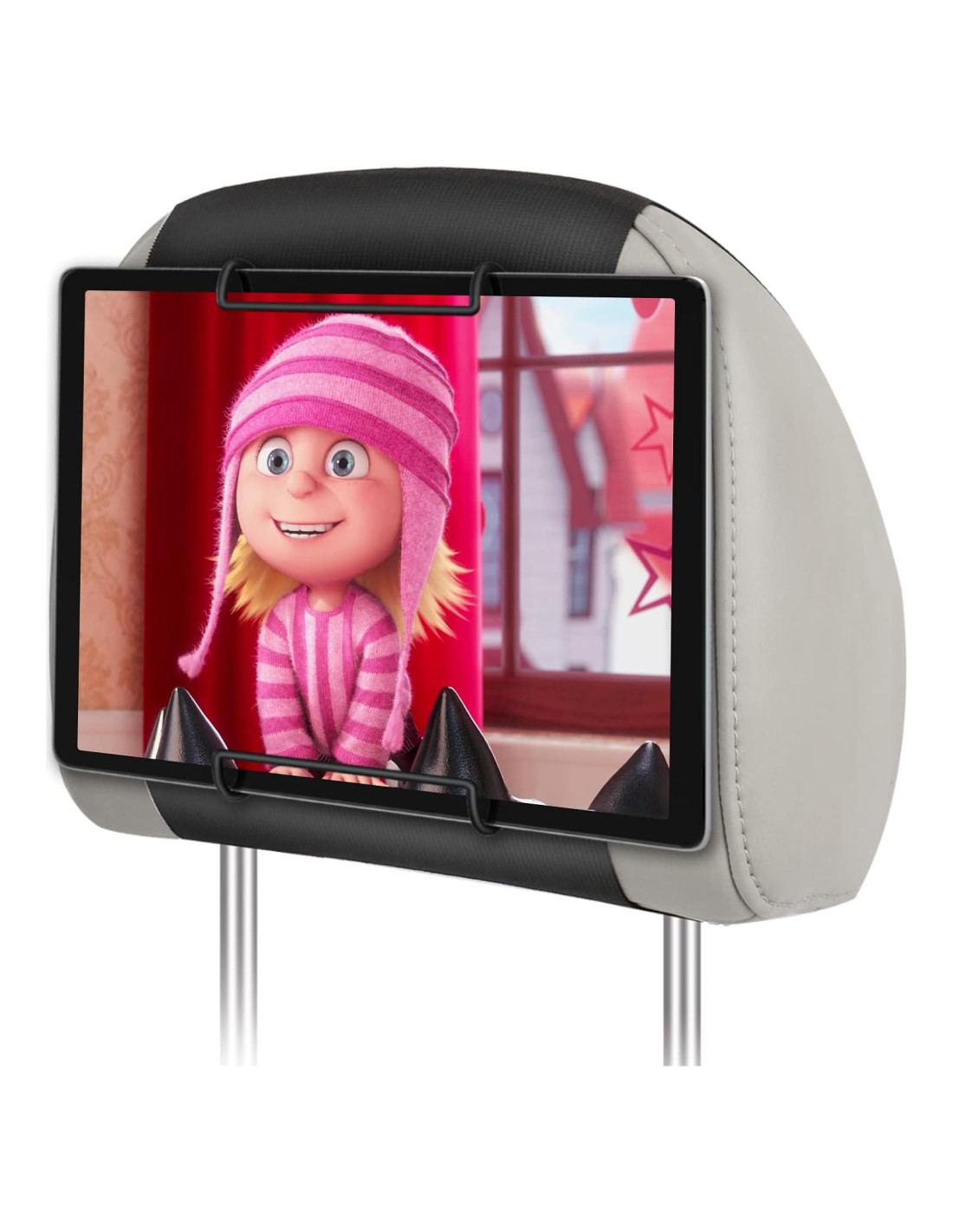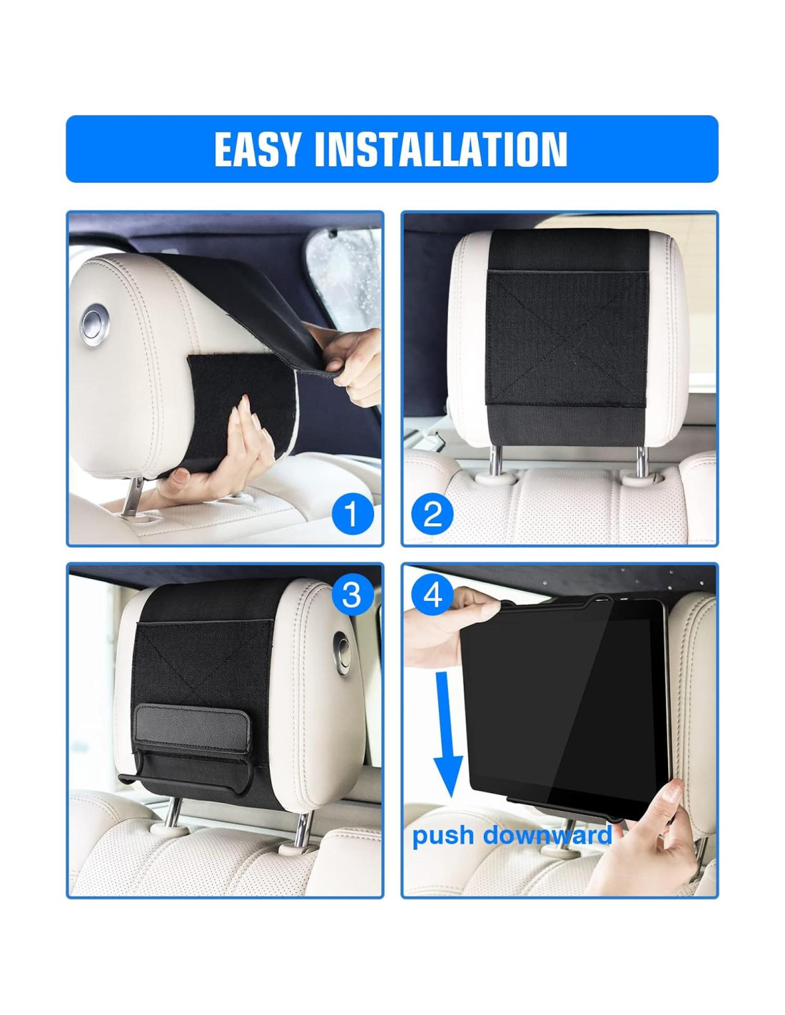 - Compañero Perfecto para Viajes en Coche. Este soporte de tableta para reposacabezas de coche se puede instalar en el asiento trasero del coche y sostener firmemente las tabletas de sus hijos. No solo puede mantener a sus hijos entretenidos durante todo el largo y aburrido viaje en coche, sino que también puede evitar la fatiga del cuello y lesiones en el brazo por sostener una tableta durante mucho tiempo. No necesita preocuparse de que su hijo haga una rabieta o llore más en los viajes por carretera, así puede concentrarse en conducir para un viaje más seguro.