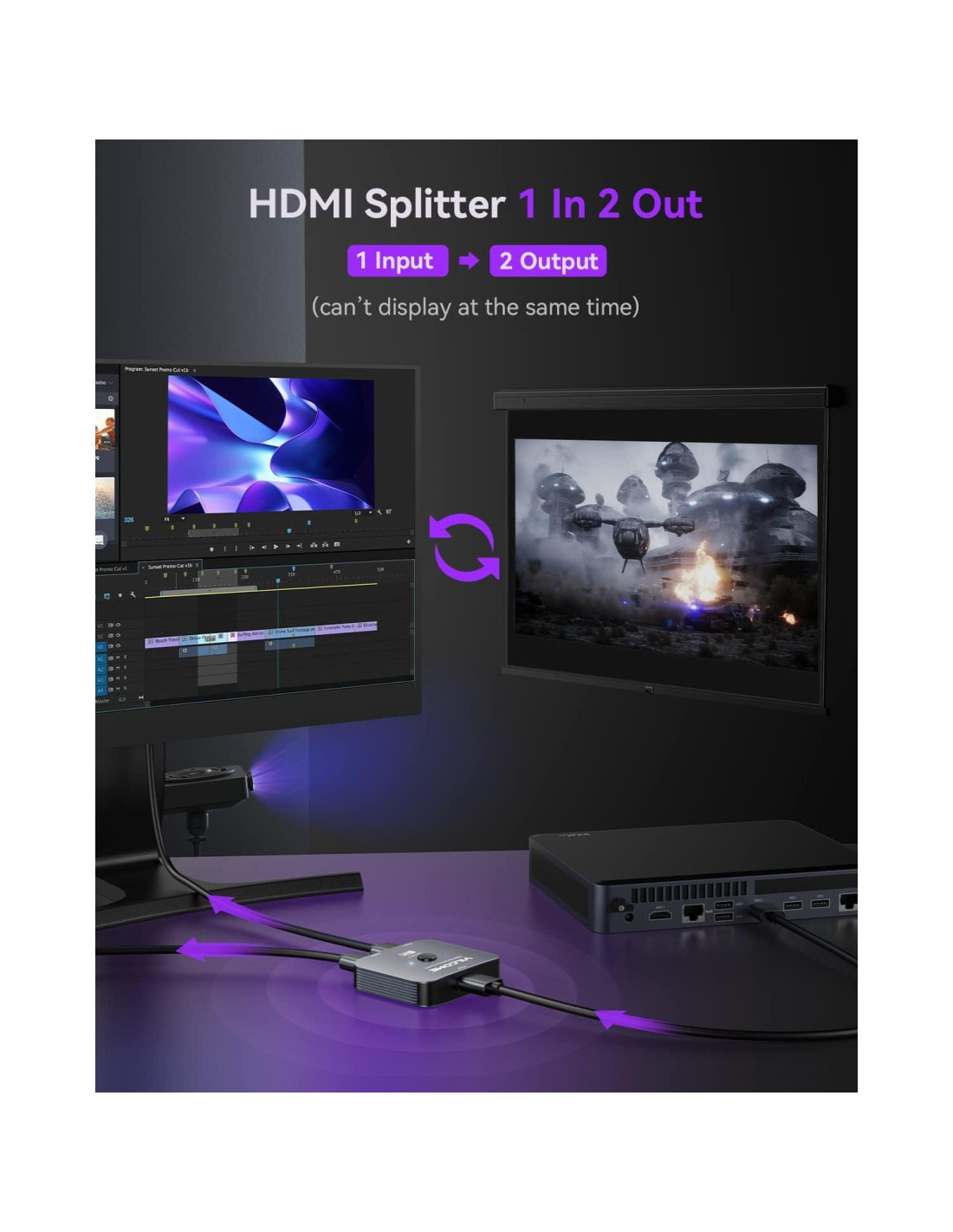 - [Interruptor HDMI 2.1 2 en 1 salida] El Interruptor HDMI 2.1 puede conectar suavemente 2 fuentes de señal HDMI a 1 pantalla (Interruptor HDMI 2 en 1 salida), o como un Divisor HDMI conectar 1 pantalla HDMI para alternar entre 2 pantallas (NO se pueden mostrar 2 pantallas simultáneamente). Ayuda a aumentar los puertos HDMI y satisfacer fácilmente la resolución 8K.