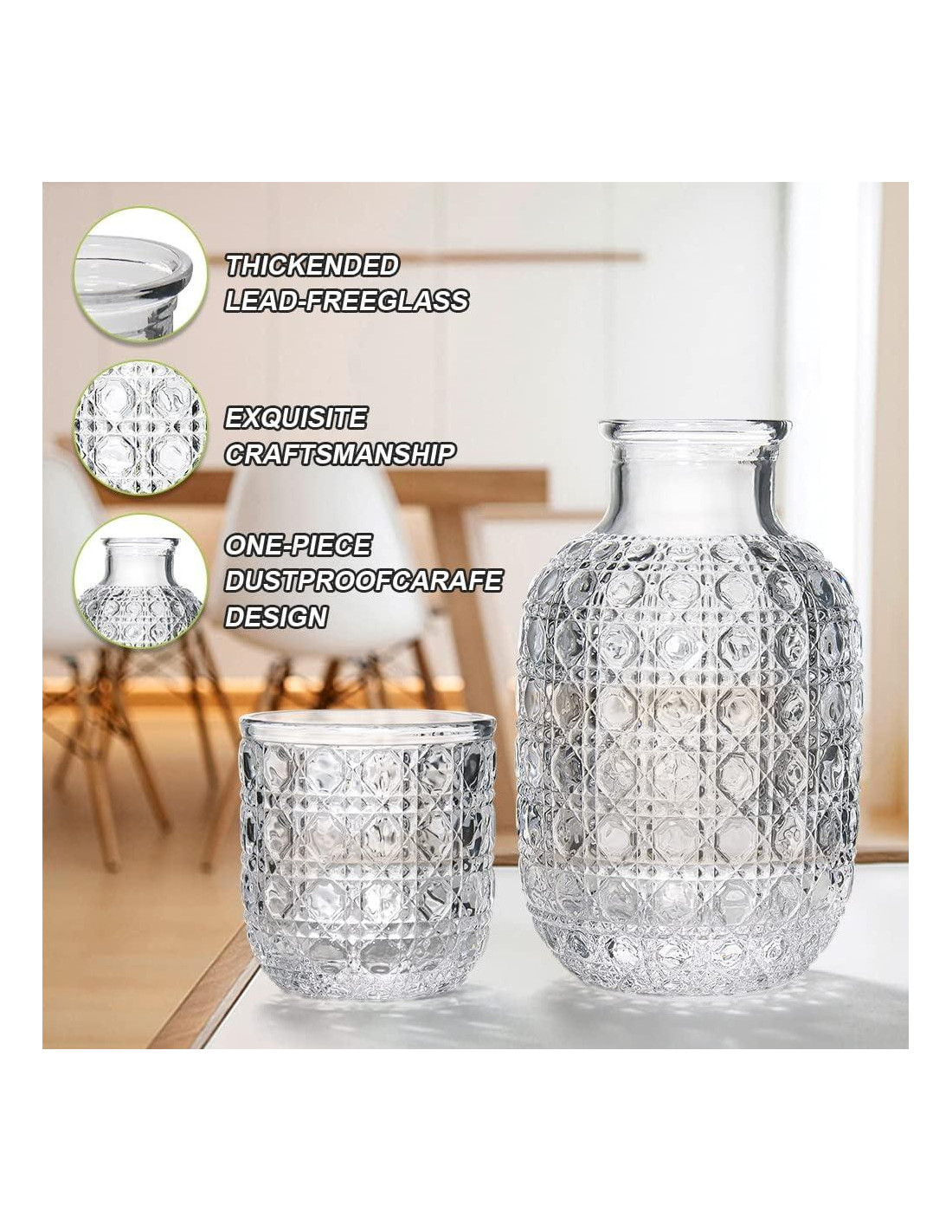 - Apariencia Exquisita: Este juego de jarra de agua de noche tiene una apariencia cristalina y clara, equipado con un elegante grabado, la noche puede darte una fuente de vida afuera, durante el día en el dormitorio, comedor o sala de estar es una decoración brillante.