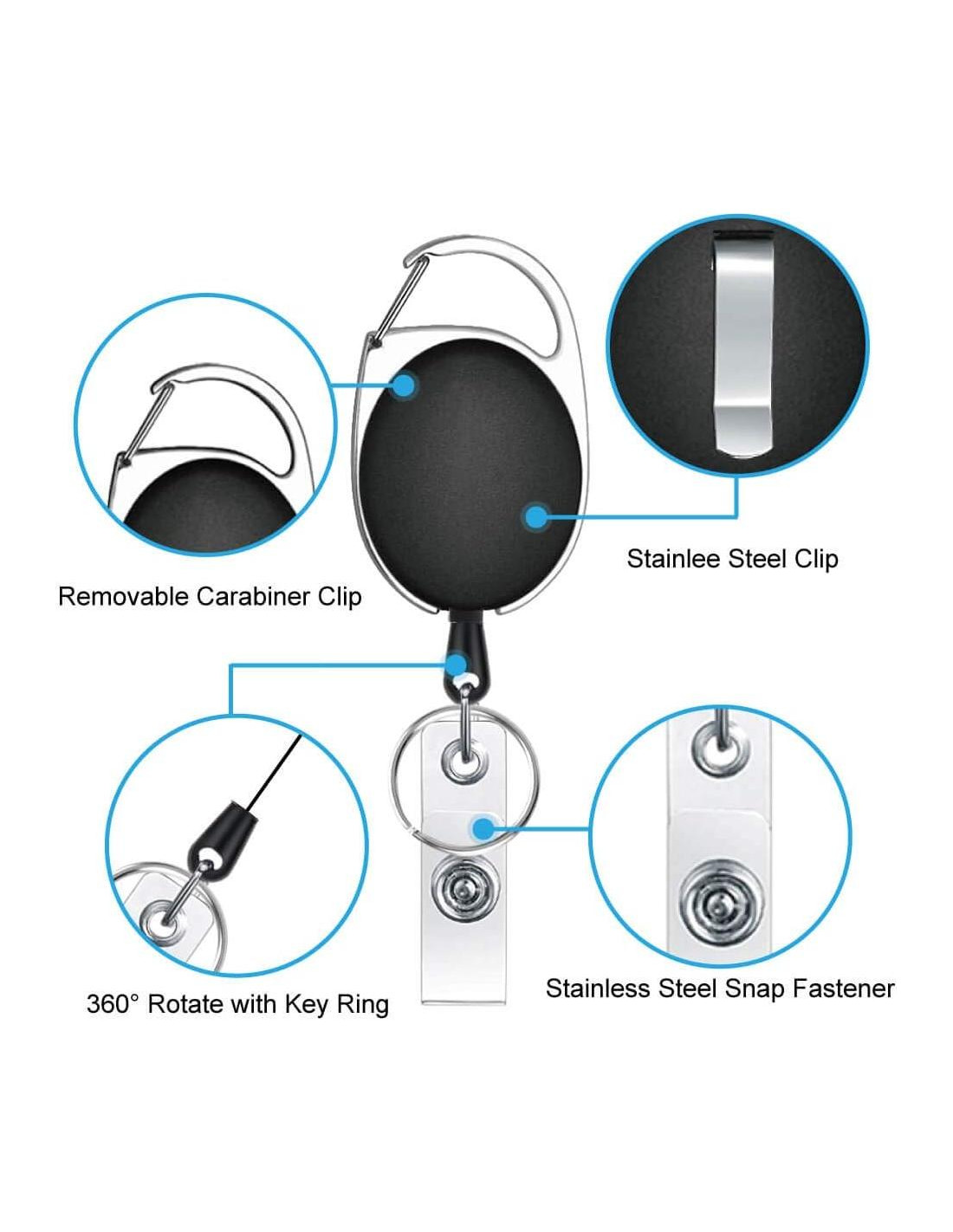- ALTA CALIDAD: El carrete de insignia tiene una carcasa de metal cromado con cubiertas de plástico duraderas, clip de carabiner que facilita asegurar a los lazos del cinturón, mochila, bolso y otros objetos