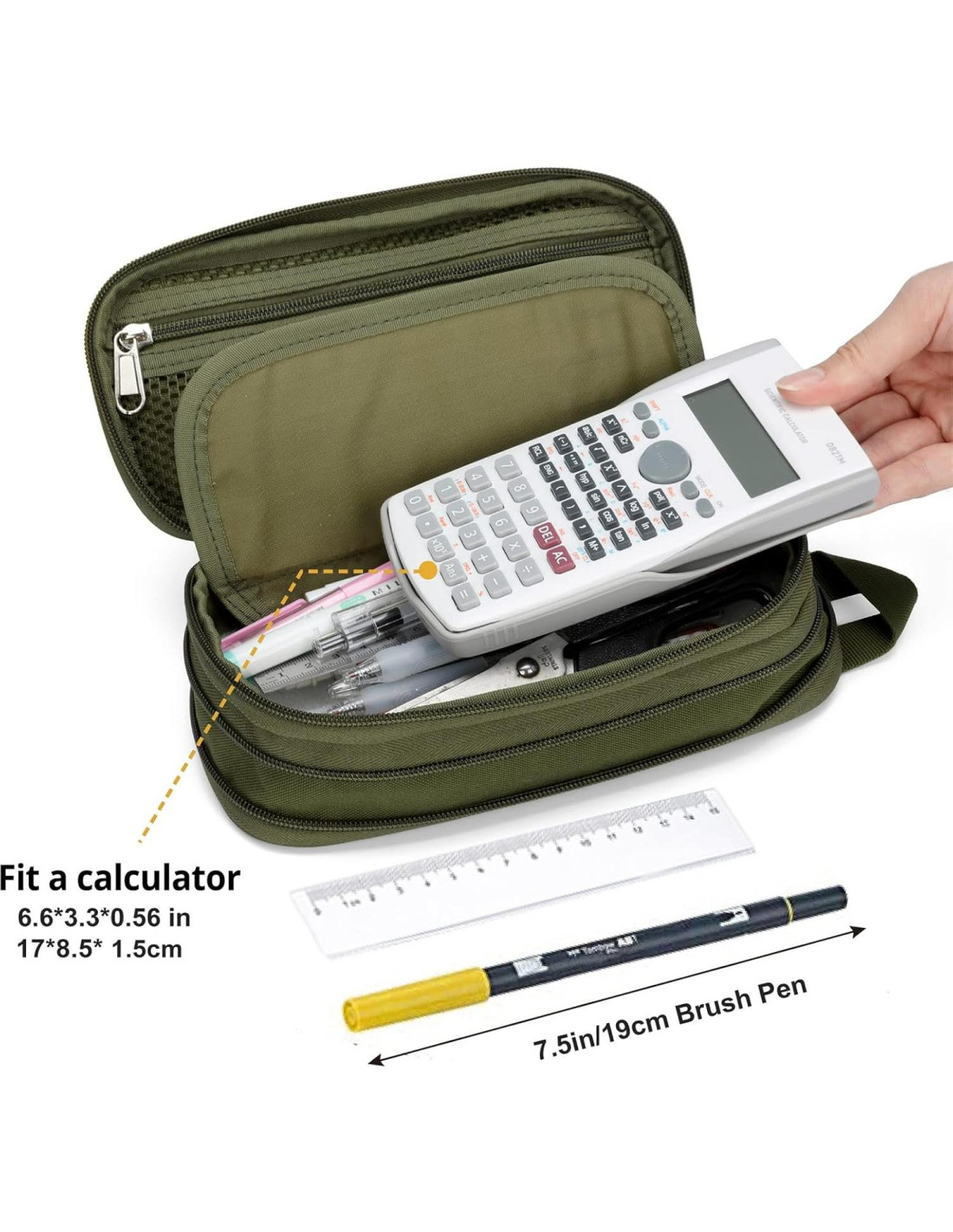 - [CAPACIDAD GRANDE MEJORADA] Estructura de cajas de lápices de gran almacenamiento con 5 ranuras en la solapa removible que pueden fijar bolígrafos de uso común y múltiples compartimentos, tiene la capacidad de almacenar y organizar hasta 50 bolígrafos o 90 lápices, incluso tijeras, notas adhesivas, goma, cinta se pueden almacenar fácilmente. Bolsa de malla con cremallera para almacenar pequeños artículos de papelería para evitar que se caigan o mantener notas pequeñas importantes. Descomprime la cremallera para expandir la capacidad y sostener una calculadora y reglas, grapadoras.