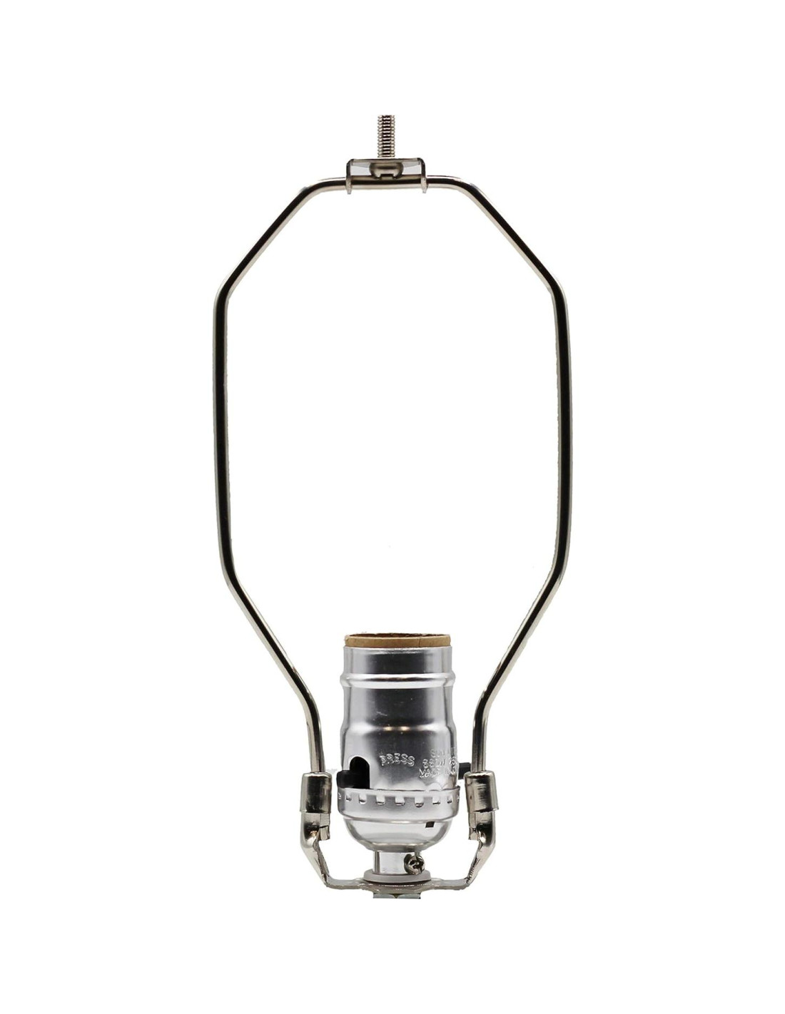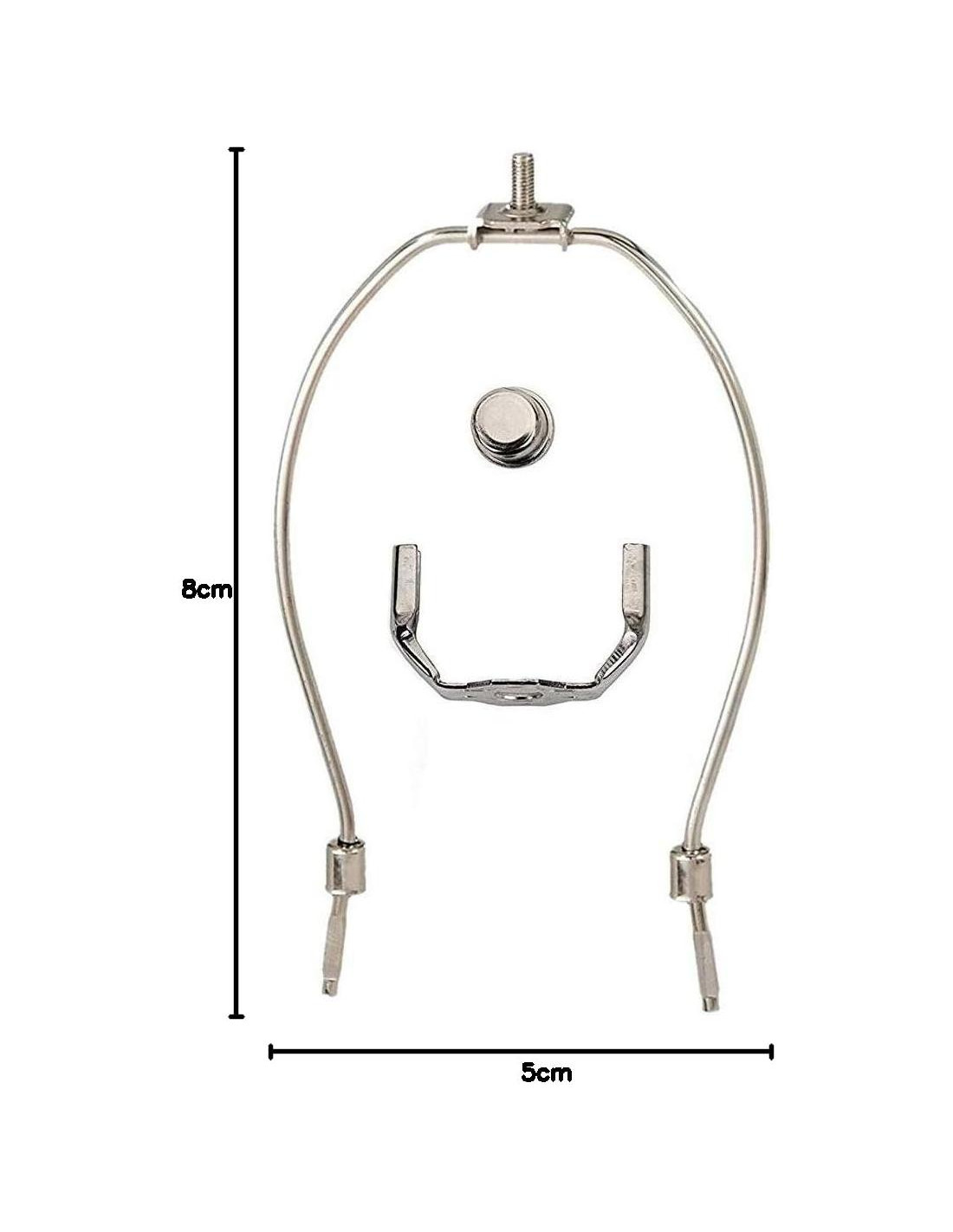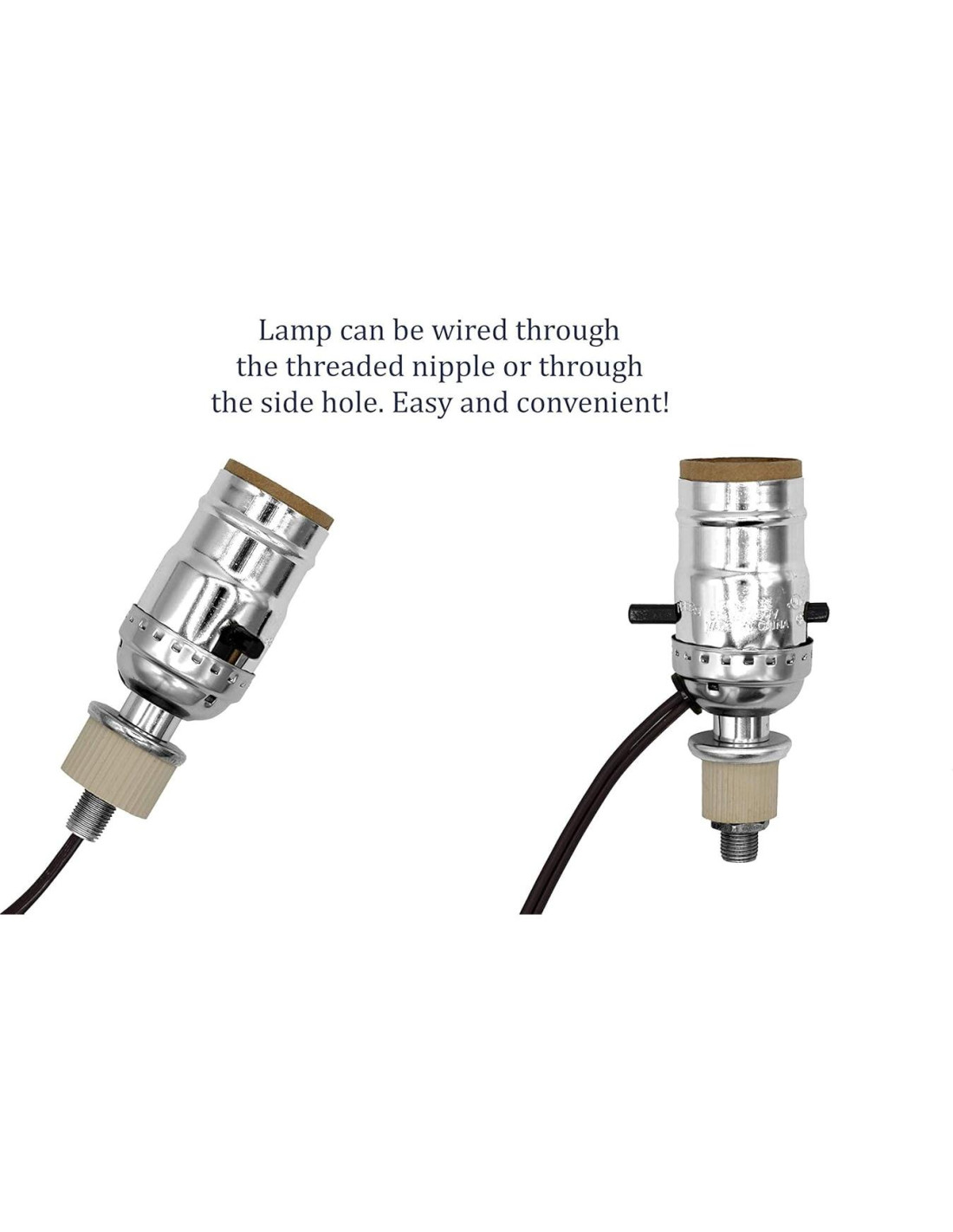 - El paquete incluye un cable de lámpara plateado de 8 pies (243,84 cm), un casquillo de lámpara push thru plateado con orificio lateral, un arpa de lámpara con base, 1 tuerca hexagonal, 1 arandela de metal, 1 arandela de goma, un tubo roscado de 1.5" (3,81 cm) y un remate.
