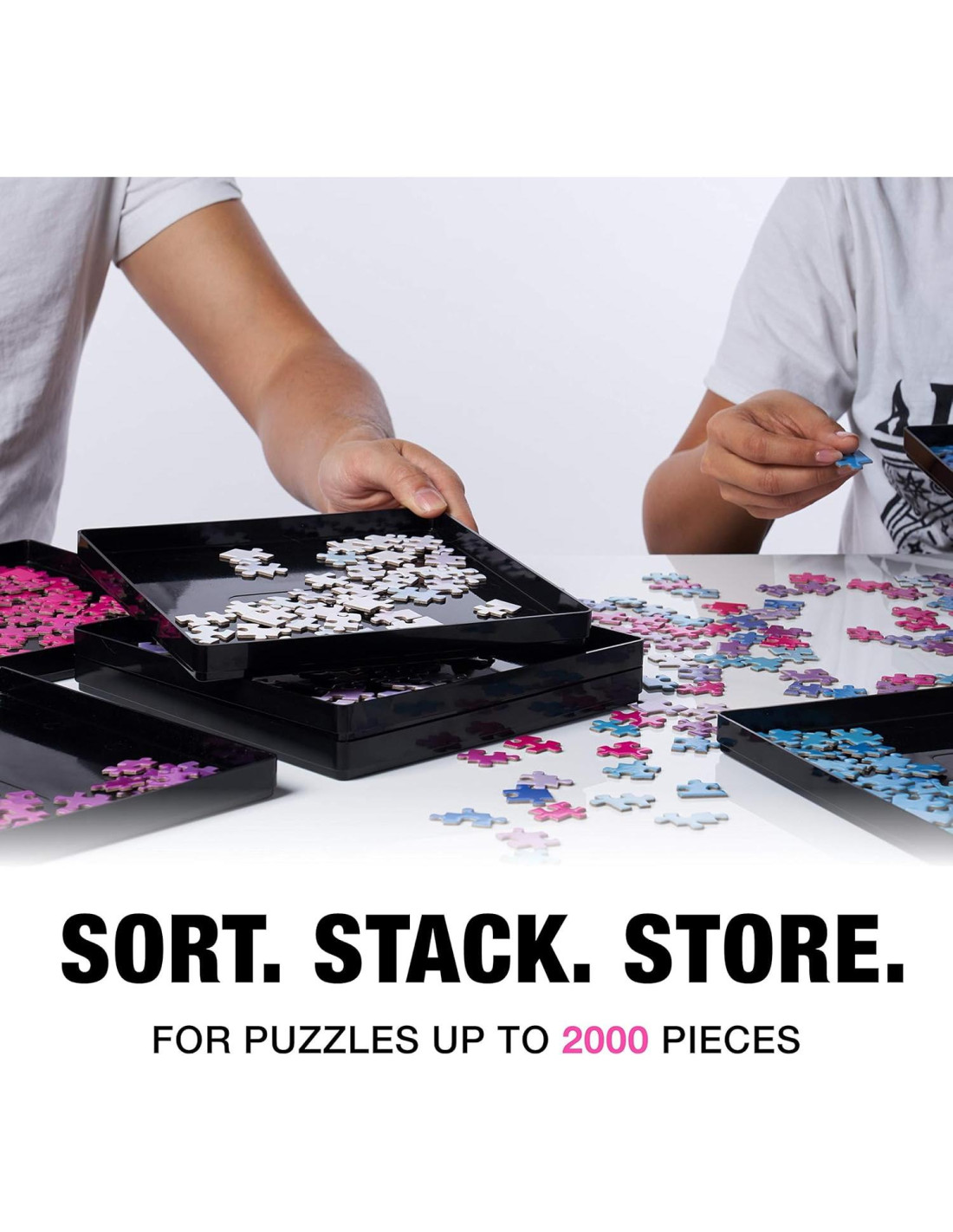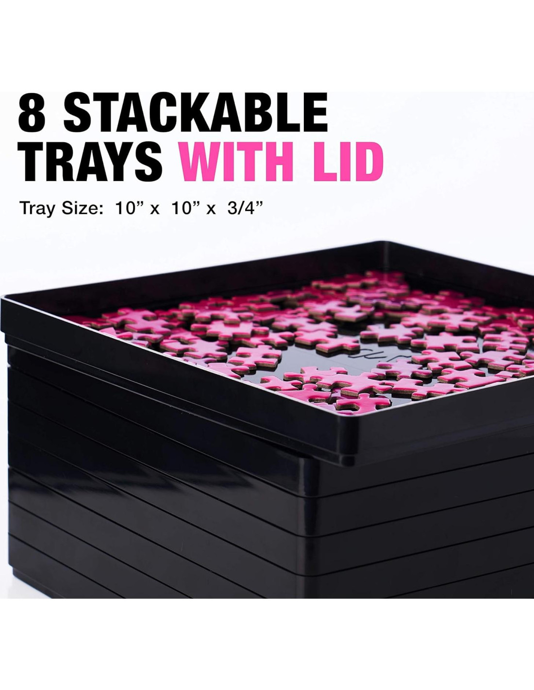 - 8 Bandejas Apilables con Tapa: Con ocho bandejas de clasificación de rompecabezas diferentes, organizarás las piezas por color, patrón y forma como si no fuera asunto de nadie. ¡Aborda rápidamente las piezas de borde, organiza ese desafiante patrón geométrico o encuentra las últimas de esas molestas piezas del cielo azul!