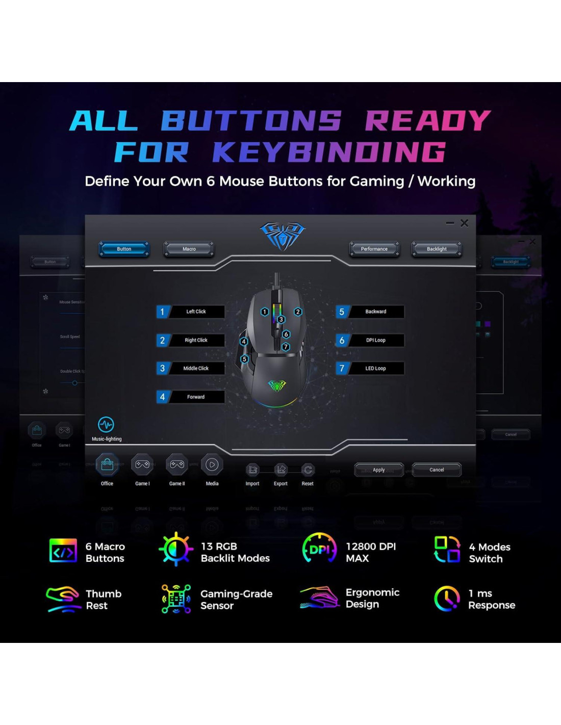 - 6 Niveles de DPI: Ratón Gaming AULA con hasta 12800 DPI de sensibilidad y una tasa de informe ultra rápida de 1ms ofrece un rendimiento de nivel competitivo para ganar fácilmente en el juego. Todos los niveles de DPI de Ratón Gaming se pueden restablecer a través del controlador (predeterminado: 1200/2400/3200/4800/7200), fácil de cambiar entre diferentes necesidades de escena