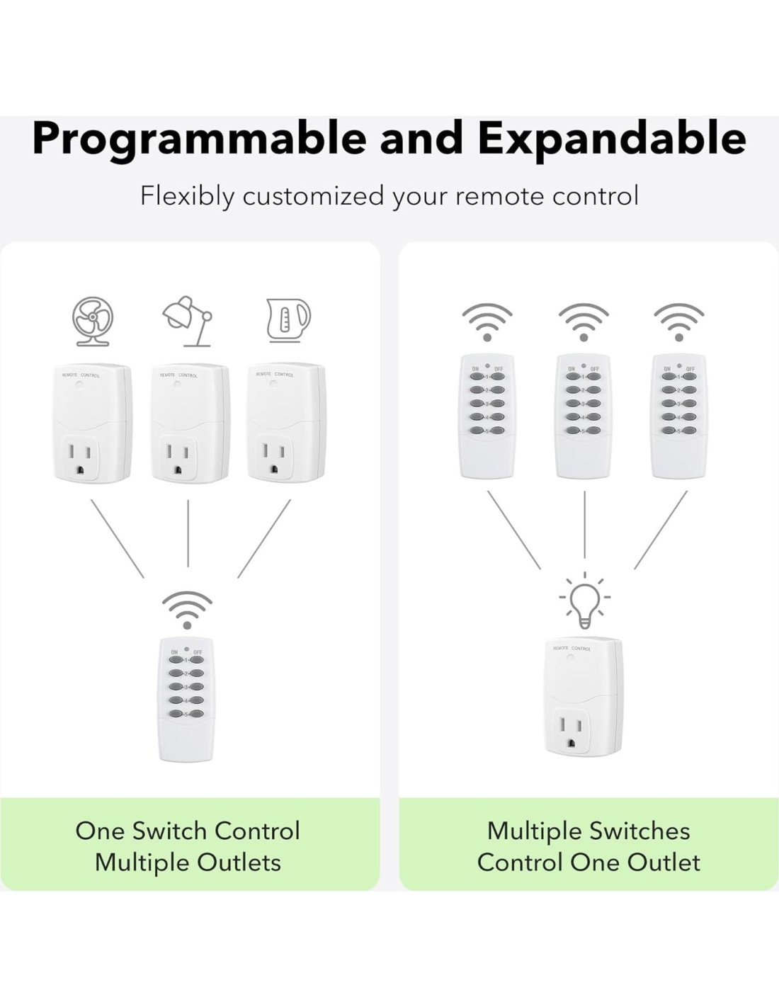 - CONVENIENCIA SIMPLE: Usa el control remoto o los propios enchufes para encender y apagar tus electrodomésticos. Ideal para casi cualquier dispositivo electrónico, incluyendo luces, aires acondicionados, calefactores, sistemas de sonido, decoraciones navideñas y dispositivos de carga.