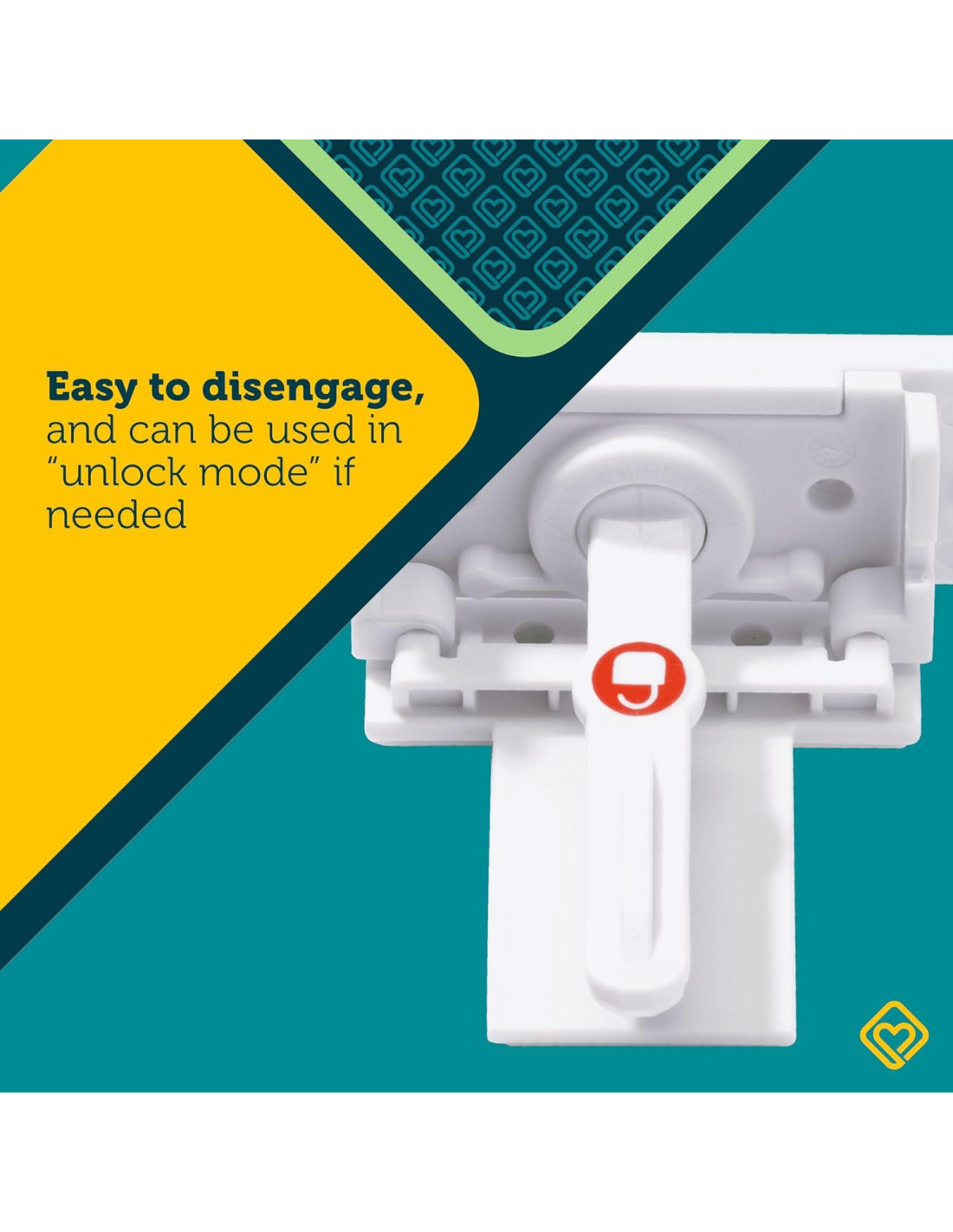 - MODO DESBLOQUEO: Las cerraduras se pueden cambiar a 'modo desbloqueo' cuando sea necesario, permitiendo un fácil acceso a cajones y gabinetes durante momentos ocupados o cuando la seguridad infantil no es temporalmente necesaria.