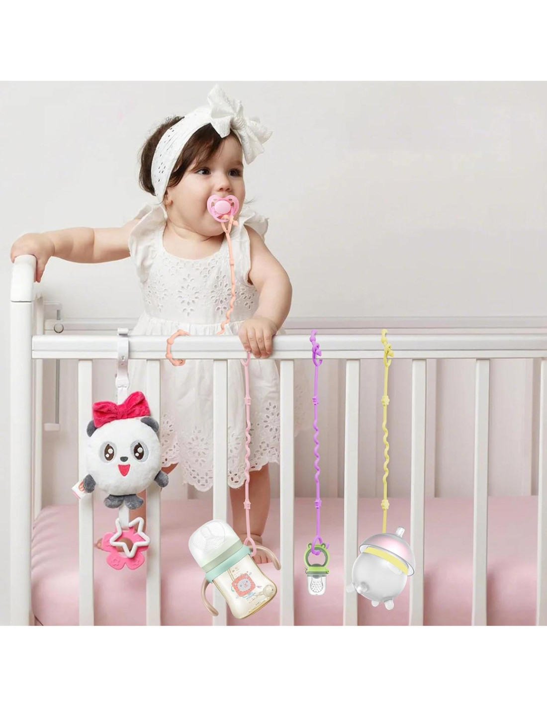 - Ámbito de Uso: Las correas para juguetes de bebé se pueden usar para cochecitos, sillas altas para bebés, clips para chupetes, juguetes de auto, juguetes para succión de bebés y cunas. Cuando el bebé está comiendo, llorando, bañándose o viajando, se puede sacar para jugar en cualquier momento. Además, la correa para chupete mordedor también es el regalo perfecto para los bebés.
