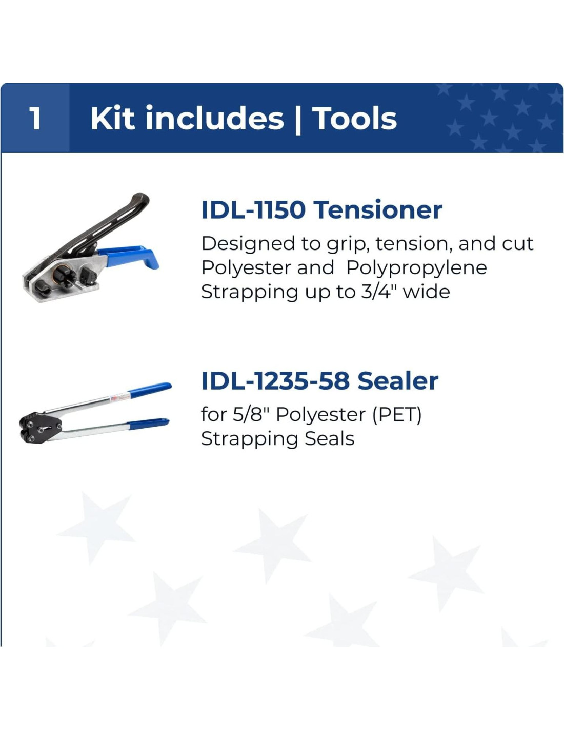 - [KIT DE ESTRIBADO DE POLIÉSTER (PET) HECHO EN EE. UU.] Este kit combina solo productos hechos en EE. UU.: 3 bobinas de estribado de poliéster de 5/8 pulgadas x 200 pies con 1400 lbs de resistencia a la rotura (600 pies de longitud total); paquete de 300 sellos abiertos y serrados de alta resistencia (proporcionan excelente resistencia de sujeción); tensador de estribado de poliéster IDL-1150 con cortador (herramienta de bandado de alta resistencia que funciona tanto con estribado de poliéster como de polipropileno); sellador de estribado de poliéster IDL-1235-58 con mandíbulas simétricas (crimpadora de alta resistencia que cierra el sello sobre el estribado de PET)