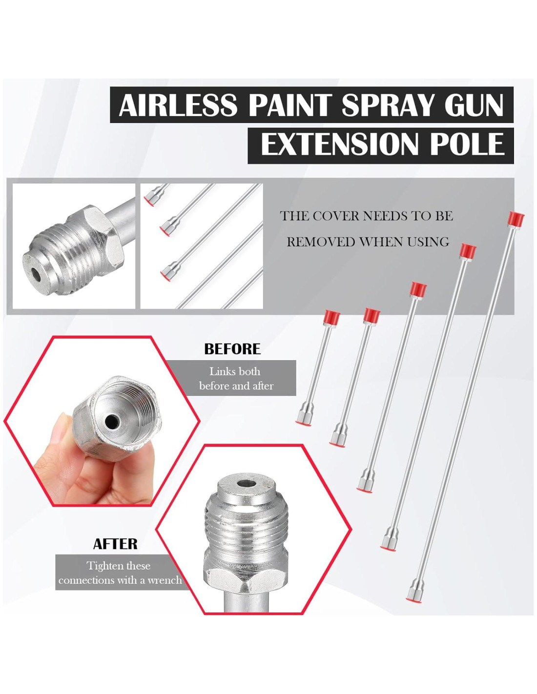 - Muchas Ocasiones: estas extensiones para pistola pulverizadora se pueden aplicar bien en muchos lugares difíciles de alcanzar, como techos, paredes en lugares altos, escaleras, etc.; Con ellas, no necesitas arrastrar una escalera cuando usas un pulverizador sin aire, ahorrándote mucho tiempo y energía