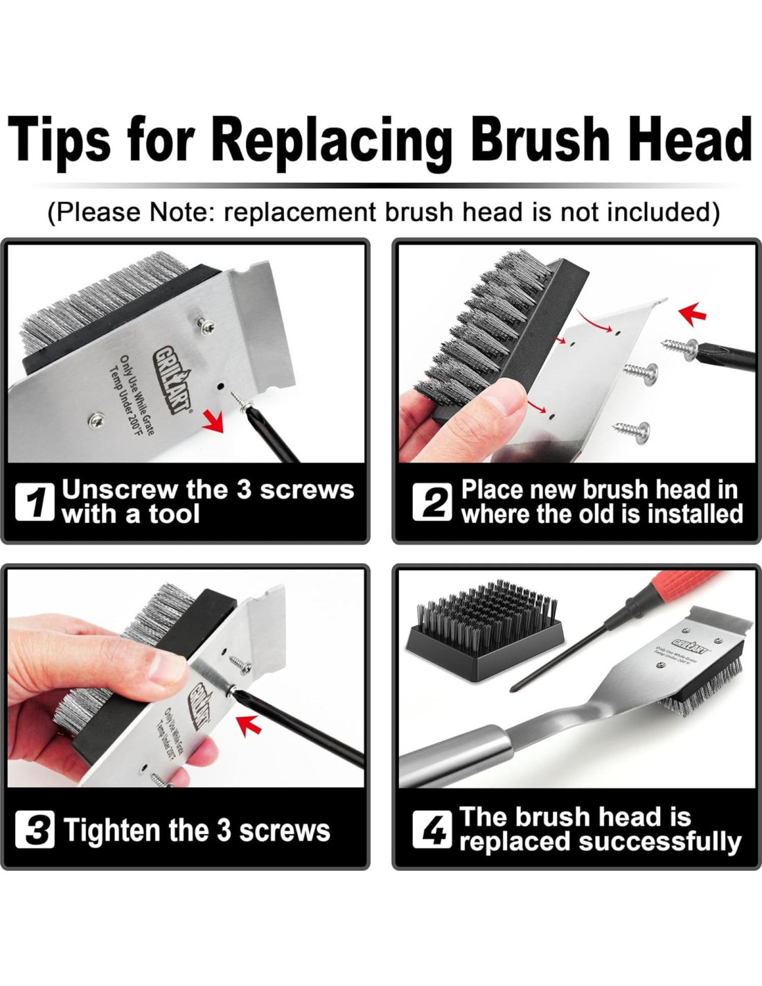 - Ecológico - cabeza de cepillo reemplazable: Cabeza reemplazable más cuerpo de acero inoxidable, significa que este chico malo puede durar toda la vida, solo no necesitas comprar otro cepillo limpiador de BBQ; Además, con un gran anillo colgante, simplemente cuelga este cepillo de parrilla donde quieras.
