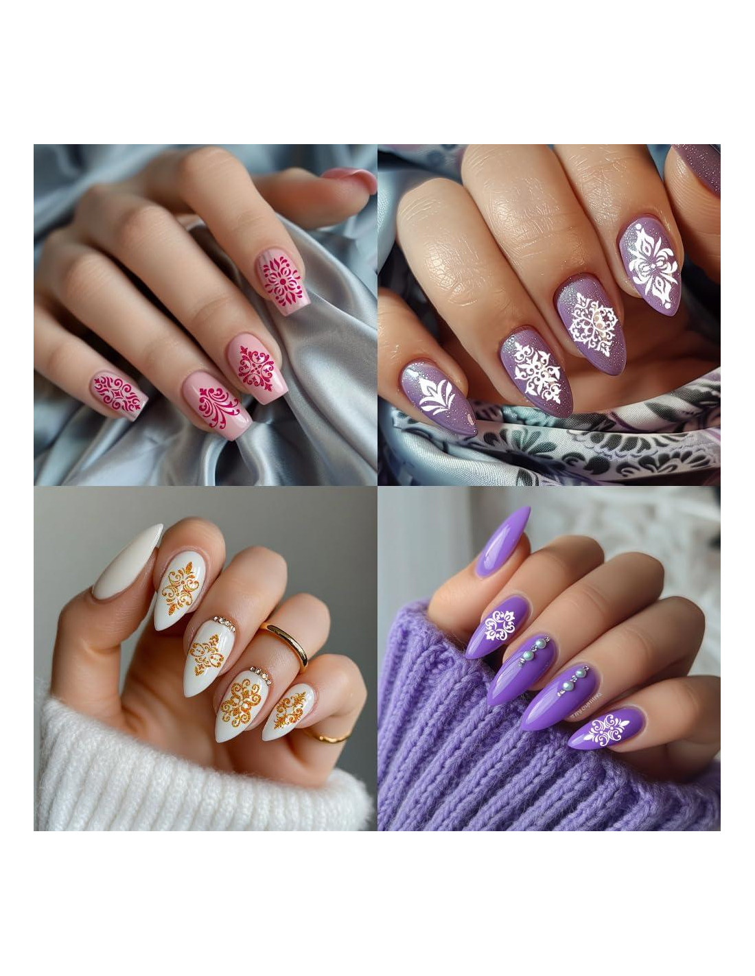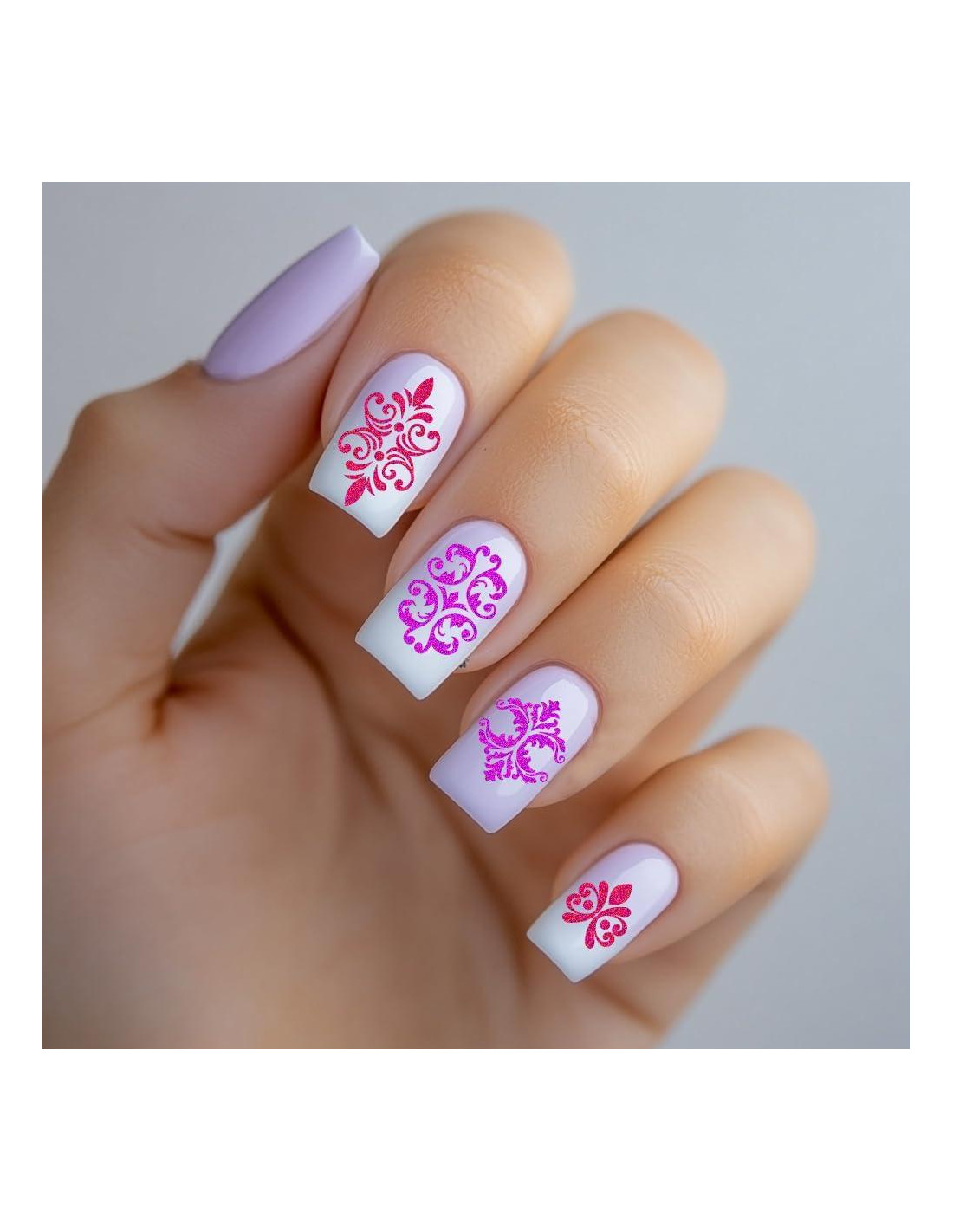 - Plantilla de Estampado Floral Francesa: Estos patrones florales franceses con estilo étnico son muy vintage y únicos, impresos en las yemas de los dedos para dar una sensación francesa misteriosa. Se incluyen un total de 3 plantillas de arte de uñas, ricas en patrones y bien impresas, fáciles de tener un patrón de arte de uñas encantador