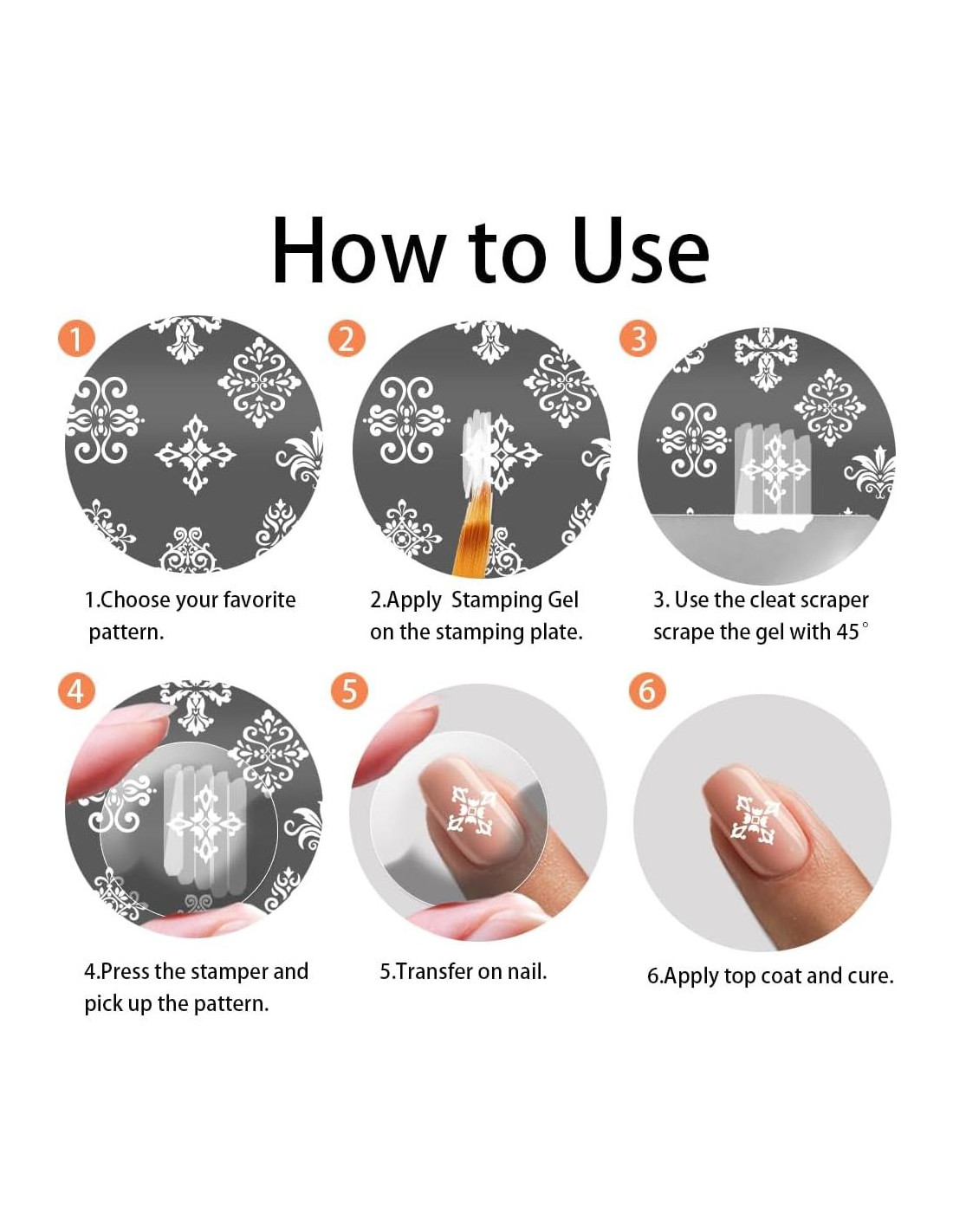 - Fácil de Usar: Puedes transferir el diseño de la plantilla de la placa a tu uña usando gel de esmalte de uñas profesional para estampado, y también se puede usar para estampado inverso, solo transfiere la imagen al estampador y llena los contornos con diferentes barnices o pintura usando un pincel o herramienta de dispensación, el conjunto de placas de estampado de uñas crea tus propios decals o stickers únicos