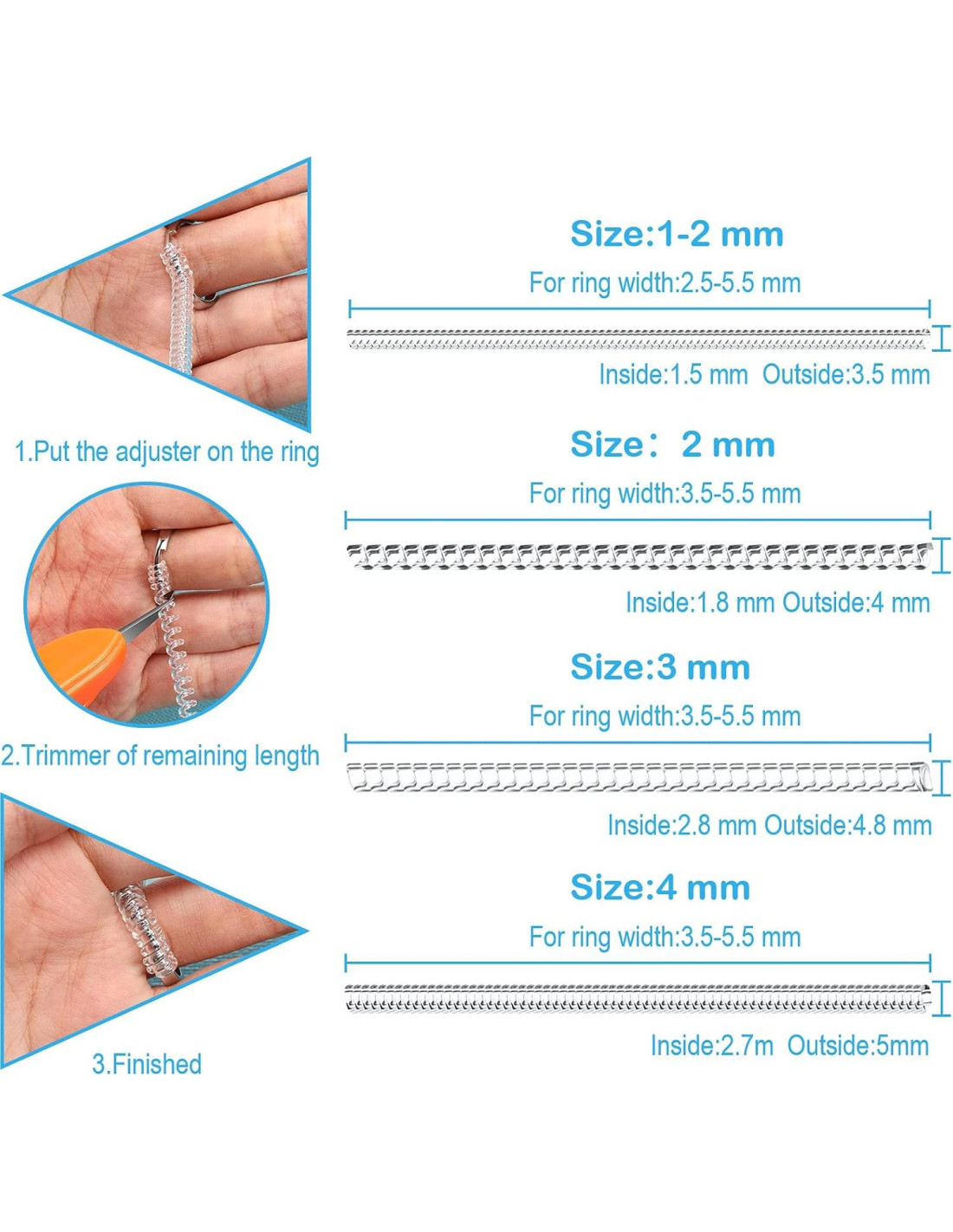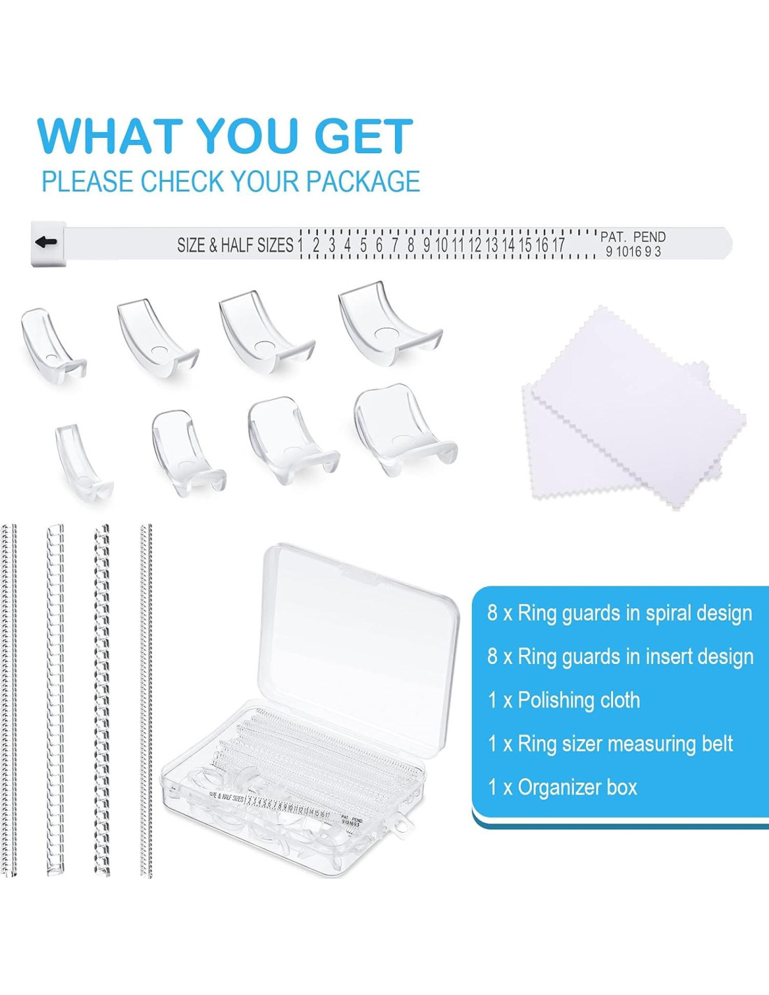- Suficiente para usar: viene con 16 piezas de ajustadores de tamaño de anillo en total, incluyendo 8 piezas de ajustadores en espiral en 4 tamaños diferentes que puedes cortar con tijeras, 8 piezas de guardanieve en diseño de inserción, que vienen con 8 tamaños, 1 pieza de paño para pulir joyas, 1 pieza de cinta métrica para tamaños de anillo y 1 caja organizadora, bonita combinación para aplicar en la vida diaria