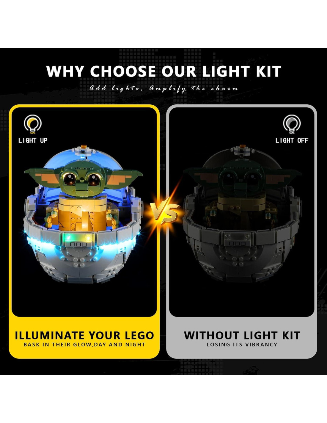 - Brillo Adorable: Este kit de luz Grogu emite tonos suaves blancos y azules alrededor del pram flotante y la base, destacando su encantador atractivo de ciencia ficción y añadiendo calidez suave a tu exhibición del modelo 75403.