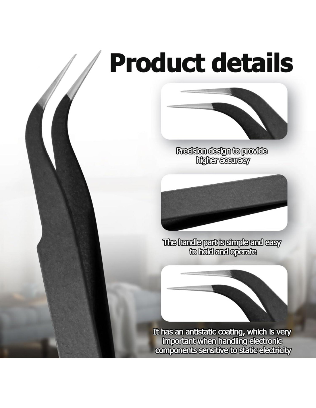- Puntas de Precisión para Manejo Preciso: Cada pinza cuenta con puntas finamente elaboradas que proporcionan una precisión excepcional para manejar incluso los componentes más pequeños. Ya sea que estés realizando tareas de soldadura intrincadas o trabajando en manualidades detalladas, estas puntas de precisión permiten un agarre seguro, asegurando precisión y eficiencia en cada trabajo.