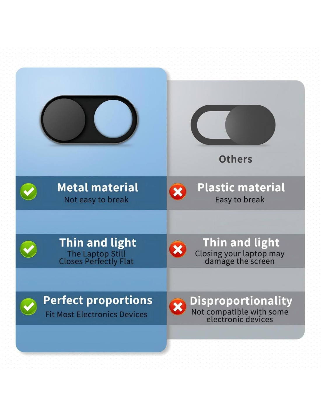 - Hecho de acero inoxidable duradero de aleación, el modelo actualizado es de 0.022 pulgadas (0.056 cm), 35% más bajo en altura que el modelo anterior, más adecuado para laptops más delgadas. No impide que las laptops se cierren perfectamente. Privacidad, seguridad y tranquilidad que mereces.