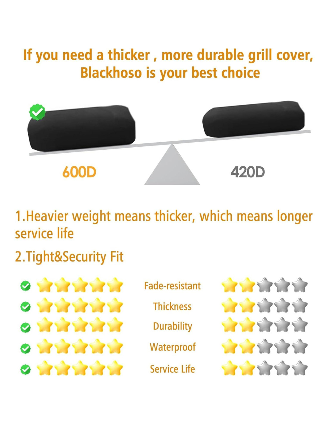 Cada Cubierta de Parrilla está diseñada para adaptarse a una amplia gama de tamaños, estilos y condiciones exteriores. BLACKHOSO fue fundada con una misión simple pero poderosa: proporcionar a los entusiastas de la parrilla cubiertas de primera calidad que protejan las parrillas de los elementos. Lo que distingue a BLACKHOSO de sus competidores es su atención al detalle y dedicación a utilizar solo los mejores materiales en sus productos. BLACKHOSO - Ya sea que tenga una parrilla portátil pequeña o un modelo grande incorporado, tenemos una cubierta de parrilla que se ajustará perfectamente y mantendrá su parrilla luciendo como nueva. Utiliza costuras de alta calidad, y la cinta selladora de costura previene filtraciones y asegura una vida útil más larga. Hecha de fibra de poliéster 600D de alta resistencia, la cubierta de la parrilla es duradera y resiste desgarros para soportar condiciones climáticas adversas. Las correas ajustables de velcro unidas a los lados hacen que la cubierta se ajuste perfectamente a la parrilla y proporcionen mejor protección contra el viento.
