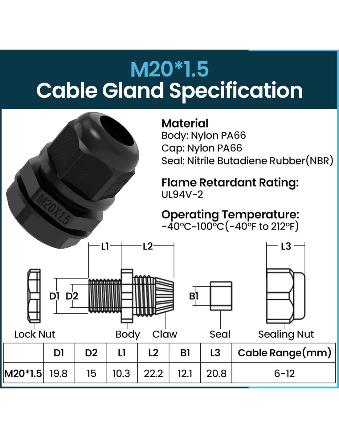 - [Especificaciones] Modelo: M20x 1.5, orificio único; Rango de cable: 6-12mm; Diámetro de rosca: 20mm; Longitud de rosca: 10mm.