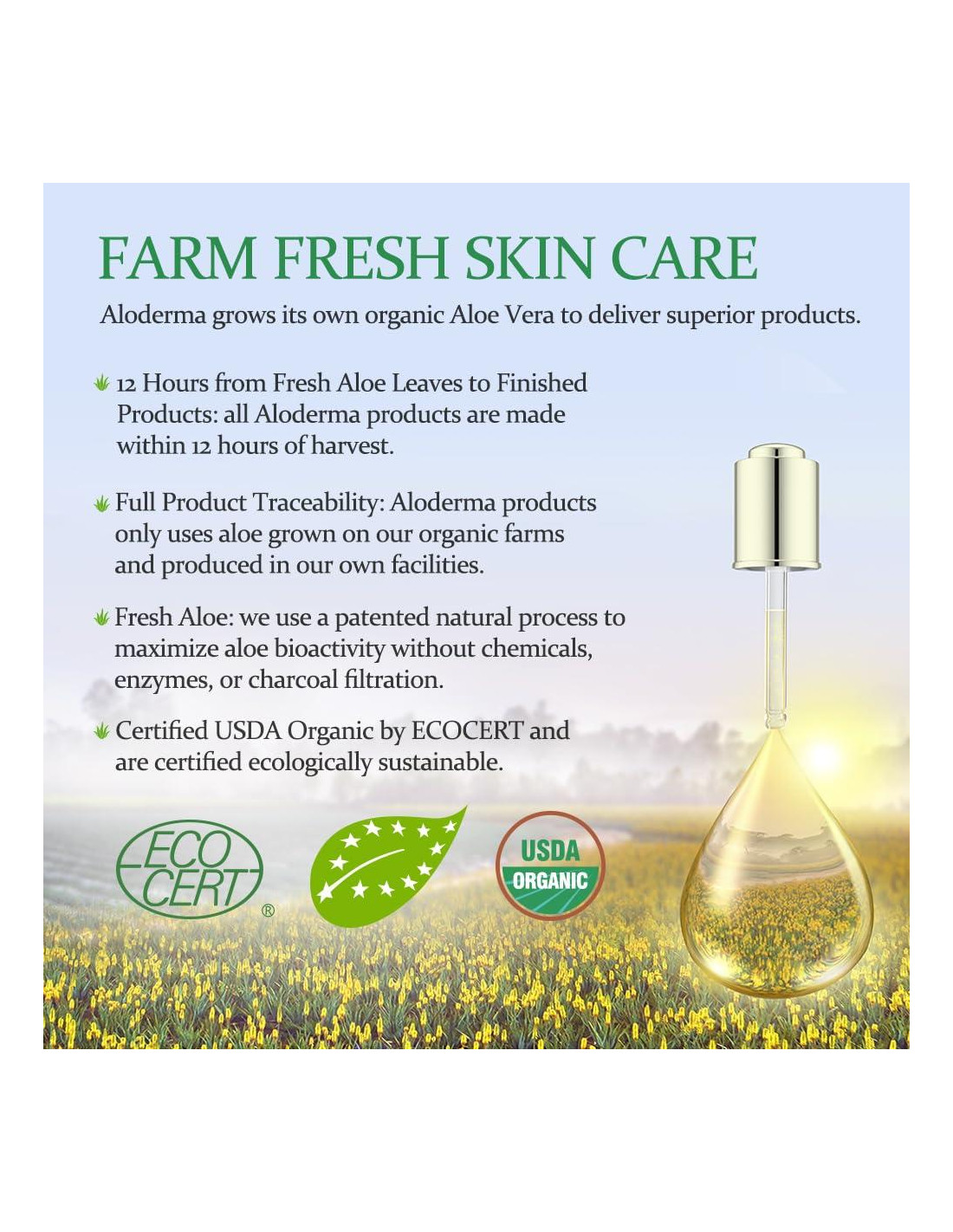 - Hecho Dentro de 12 Horas de la Cosecha: En Aloderma, nuestro cuidado de la piel está arraigado en la tierra. Nuestro aloe se procesa en el lugar y se convierte en productos finales dentro de horas de salir de los campos para asegurar que capturamos el poder natural del Aloe Vera en cada producto que fabricamos.