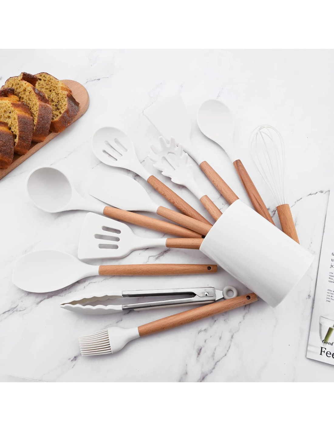 Materiales de silicona de alta calidad con mango de madera, sin liberación de sustancias nocivas en los alimentos, saludable y seguro para tu cocina diaria. Debido a la superficie antiadherente, son bastante fáciles de limpiar a mano y aptos para lavavajillas. Los utensilios blancos con soporte iluminan tu cocina y no causarán desorden. Todas las diferentes opciones que tendrás con este set. Fácil de limpiar y duradero mango de madera. No se oxida, no se deforma. Silicona de grado alimenticio premium. No raya, no se astilla, no se deforma ni se derrite como otros utensilios de cocina. Antiadherente. La suave silicona no se pegará a las ollas o a tus costosas sartenes. Resistente al calor. El set de utensilios de cocina es ligero y elegante, ideal para saltear, no solo decora tu cocina, sino que cocinar ya no es una labor pesada, puedes disfrutar fácilmente del proceso de cocinar.
