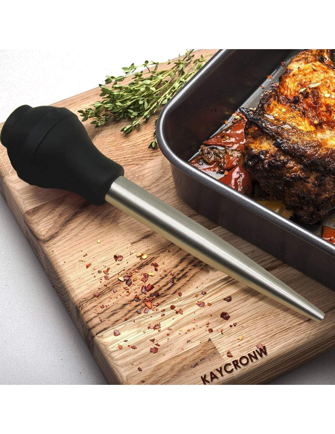 - La banda en ángulo en el bulbo del baster mantiene el baster estable en la encimera cuando no está en uso. Aguja de inyección de acero inoxidable y cepillo de limpieza incluidos, añade más sabor a tus creaciones de carne con nuestro inyectador de sabor. Simplemente atornilla al baster para transformarlo en un inyectador de marinada y salsa muy útil. ¡Añade una explosión de sabor a cada bocado!