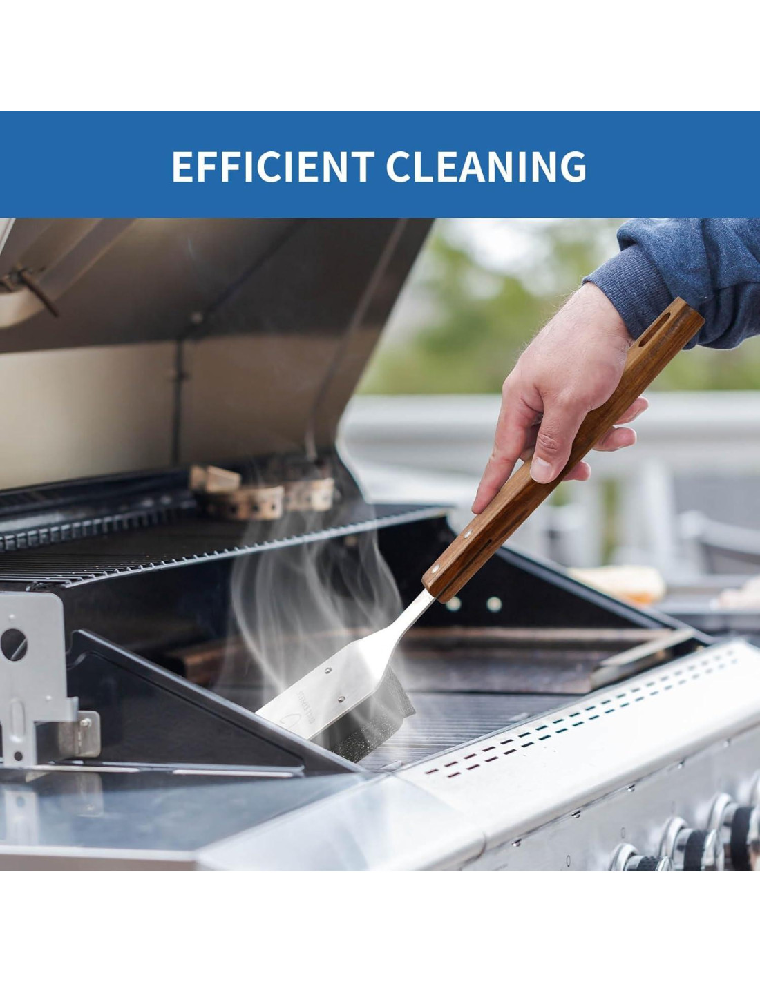 - [Agarre Ergonómico y Protegido del Calor] El mango de acero inoxidable extra largo previene la flexión, mientras que el agarre de madera antideslizante mantiene las manos frescas y seguras del calor de la parrilla. El raspador angulado aborda sin esfuerzo los bordes y las esquinas-¡sin ángulos de muñeca incómodos!