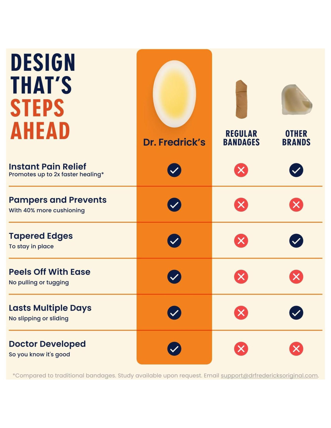 - Un compromiso con tu satisfacción: En Dr. Frederick's Original, priorizamos tu satisfacción, lo que significa crear los mejores productos posibles para ti. Respaldamos los vendajes Better Blister con nuestra promesa líder en la industria. Si nuestro producto no te ayuda a volver a hacer lo que amas, estamos dedicados a encontrar una solución satisfactoria.