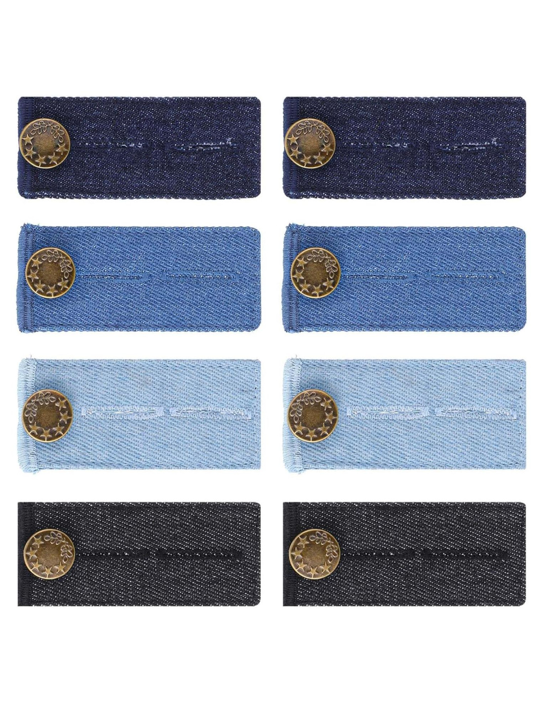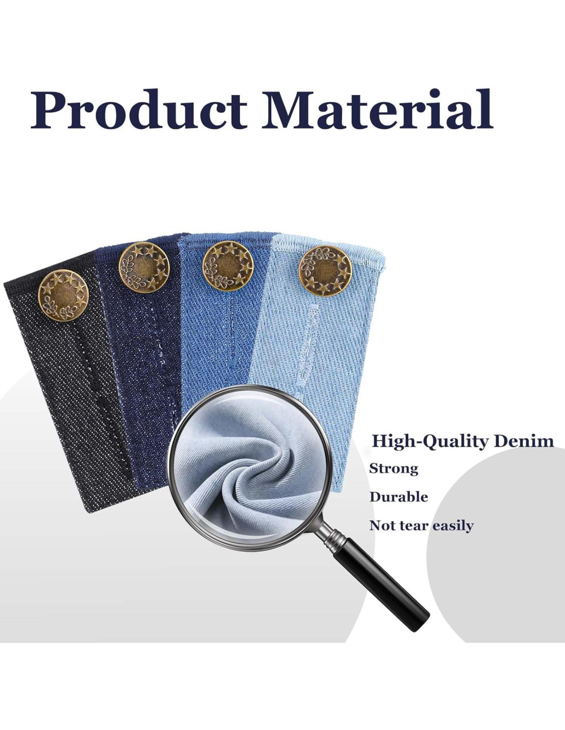 - [Calidad Premium] Fabricados con mezclilla de alta calidad, estos extensores de cintura ofrecen tanto durabilidad como comodidad. Los materiales suaves pero resistentes resisten el desgaste diario, manteniendo su forma y proporcionando un soporte confiable. Con botones de metal robustos, nuestros extensores están diseñados para perdurar, demostrando ser reutilizables y resistentes a la deformación, lo que los hace ideales para prendas de mezclilla.