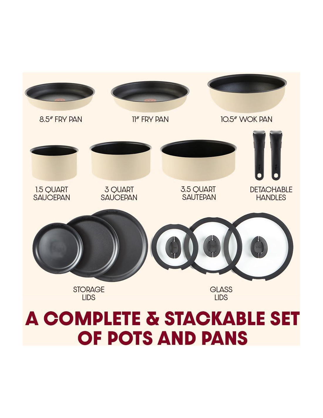 - ¡Regala la alegría de la eficiencia del espacio! El diseño apilable ahorra hasta un 60% más de espacio en comparación con los juegos de mangos fijos de T-fal. Este juego todo en uno para cocinar, hornear y servir es ideal para cocinas pequeñas, RV y otros espacios limitados.
