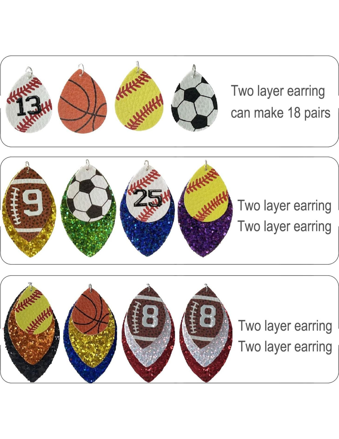 - Diversión DIY: 12 colores de cueros sintéticos brillantes y 5 tipos de pelotas deportivas. Ya sea que prefieras pendientes de una capa, dos capas o incluso tres capas, simplemente usa el abridor de anillos para adjuntar el gancho y el cuero.