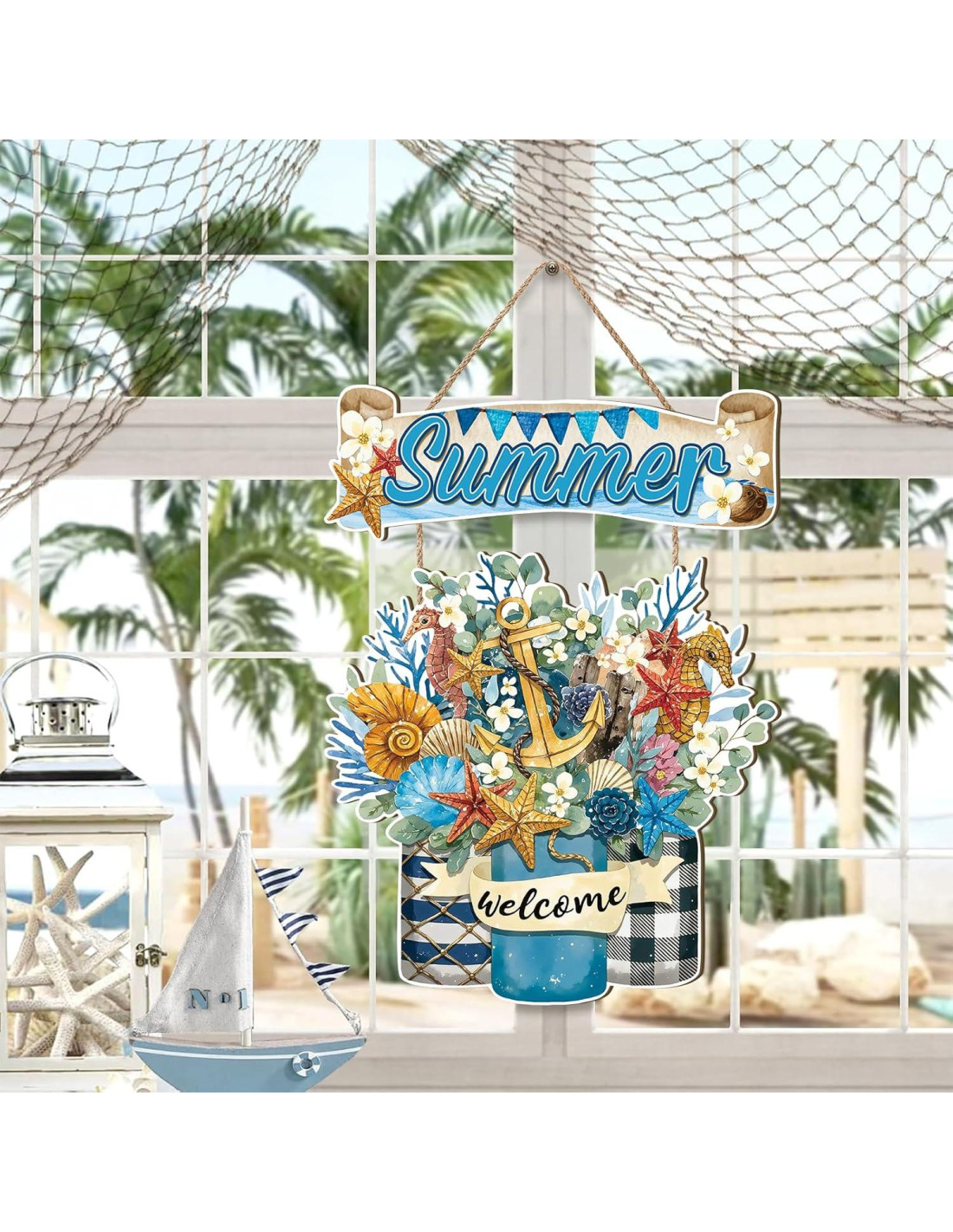 - Colgante de puerta de bienvenida verano: Esta placa decorativa de verano contiene elementos náuticos como flores, conchas, caballitos de mar, estrellas de mar, conchas, coral, algas marinas y otros elementos náuticos, junto con el texto de bienvenida del verano, para agregar una atmósfera tropical de verano a tu hogar. Esta es una gran decoración de verano montada en la pared que puede agregar la atmósfera misteriosa del mundo submarino a la decoración de tu hogar.