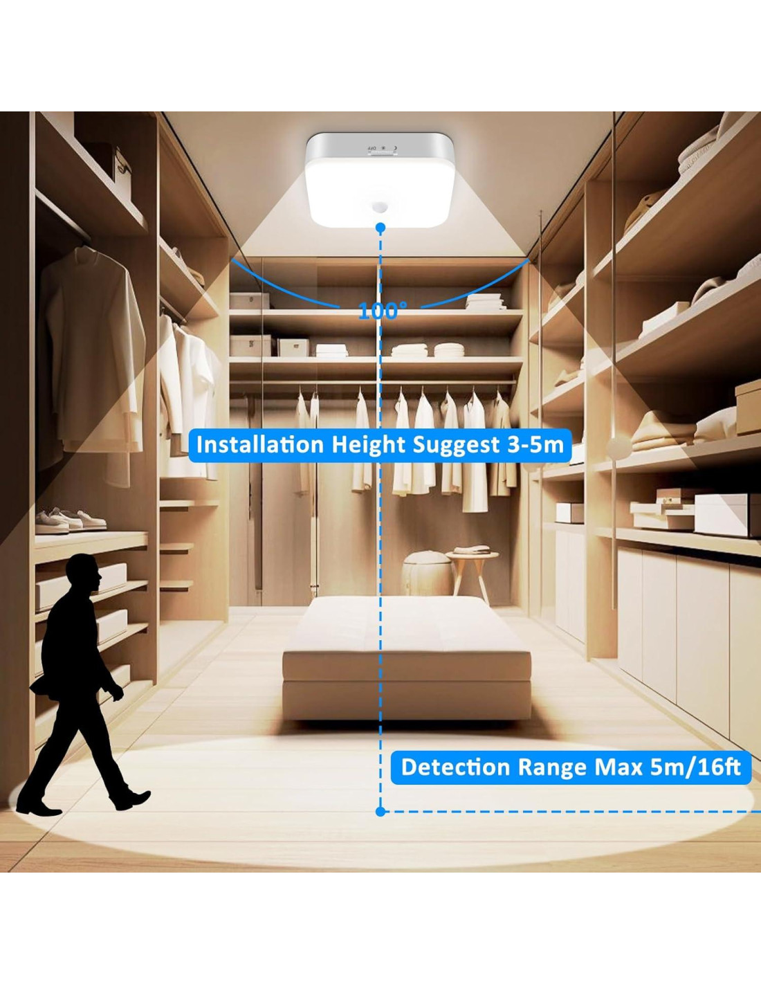 - Luz para armario sin electricidad. Con el soporte y el hardware de montaje proporcionados, puedes instalar rápidamente y fácilmente la luz de techo operada por batería en menos de 5 minutos, sin preocuparte por la oscuridad y el desorden de cables. La luz de movimiento interior inalámbrica para el baño también puede mejorar la iluminación para ancianos, niños, previniendo caídas al caminar en áreas oscuras.