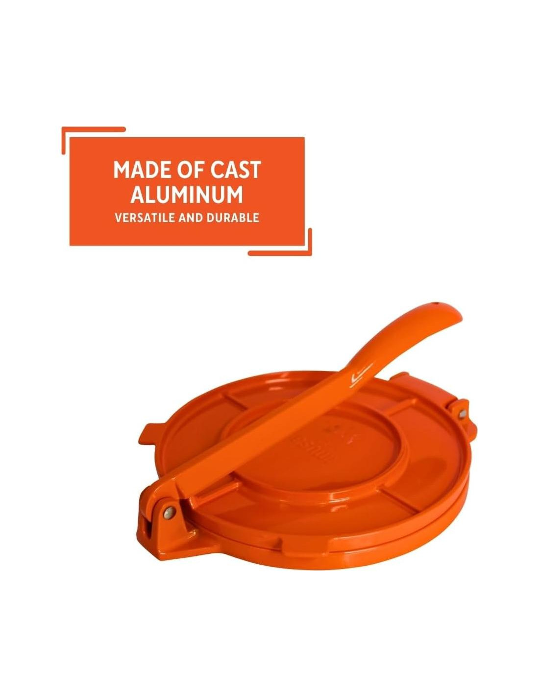 La prensa de tortilla naranja de 8" de IMUSA es una herramienta de cocina versátil y eficiente diseñada para crear delicias caseras. Construida de aluminio fundido duradero, presenta una superficie gris elegante que no solo añade un toque moderno, sino que también la hace más ligera que las prensas de hierro fundido tradicionales, asegurando una operación más cómoda. El mecanismo de palanca fácil de usar hace que presionar tortillas sea rápido y sin esfuerzo, mientras que su diseño amigable se extiende a la fácil limpieza y almacenamiento. Esta prensa versátil no se limita a las tortillas; también es excelente para hacer tostones, arepas, panes planos, empanadas, pan de pita, roti, dumplings y mucho más. Ideal para crear tortillas frescas y presionar varios tipos de masa, la prensa de tortilla gris de IMUSA es un compañero confiable en la cocina, combinando durabilidad, facilidad de uso y una estética contemporánea para una experiencia de cocción sin problemas. Confía en la prensa de tortilla IMUSA como tu ayudante de cocina de confianza. Sin duda se convertirá en el compañero querido de tu cocina, simplificando y mejorando tus esfuerzos culinarios.