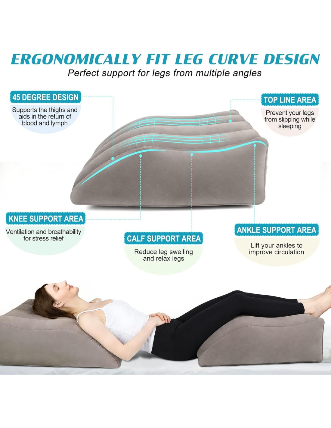 - Alivio del dolor y mejor sueño. Nuestro cojín para elevar las piernas con diseño reclinable de 45 grados y diseño ergonómico ayuda a promover la circulación sanguínea, reducir el dolor de rodillas, espalda y postoperatorio, aliviar la presión y la hinchazón de las piernas. Los cojines en cuña también pueden relajar las piernas, aliviar la fatiga y mejorar la calidad del sueño.