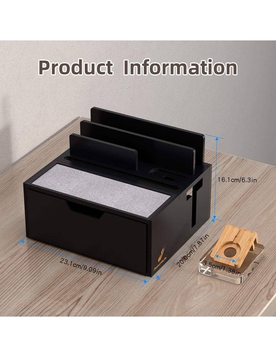 - Lo que obtienes: 1 * Soporte de Acoplamiento de Bambú con Cajón; 1 * Fuente de Alimentación de Cargador (USB HUB 5Puertos); 1 Juego de 5 Cables (Longitud: 1FT; Incluye 2 * cables iOS, 1 * cable Android, 2 * cables Type-C). Un soporte de acoplamiento adicional para reloj inteligente