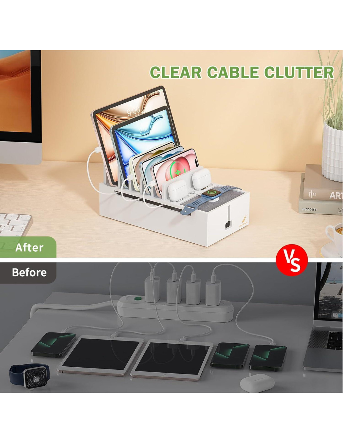 - Base Más Grande y Ancha: La estación de acoplamiento tiene una base más grande y ancha (Tamaño 28 x 15 cm) adecuada para una variedad de fuentes de alimentación. Puede almacenar fácilmente la regleta y ocultar los cables para mayor seguridad. Cuatro almohadillas antideslizantes en la parte inferior aumentan la estabilidad