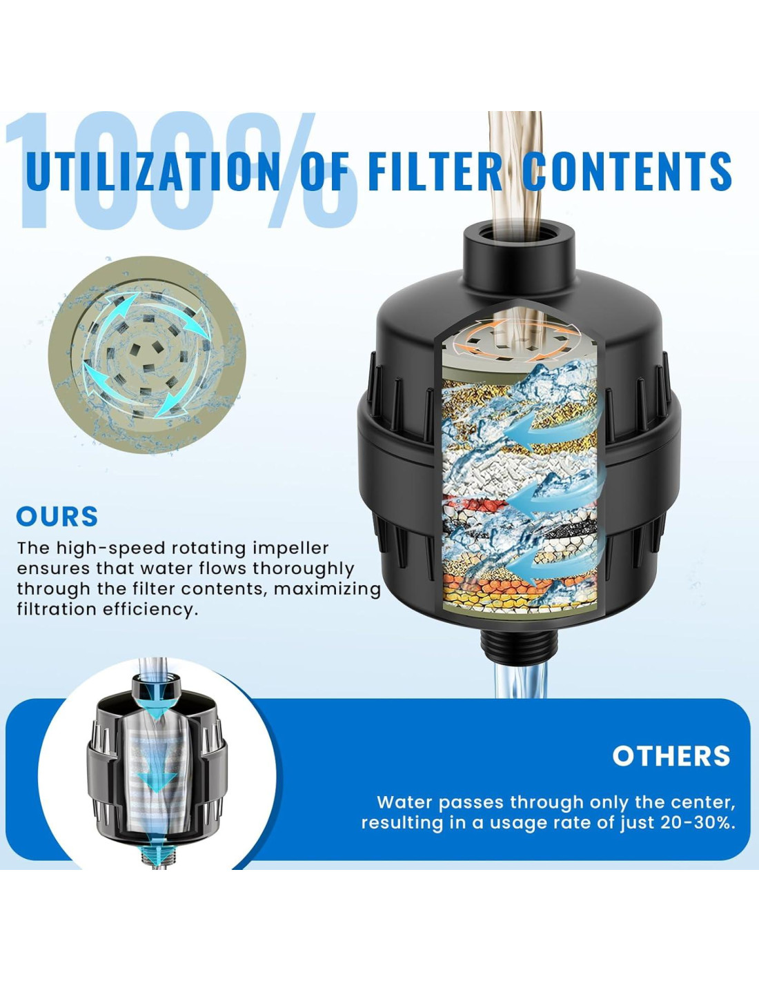 - Eficiencia de Filtración Superior: Con un impulsor de alta velocidad, este filtro de cabezal de ducha para agua dura mejora el flujo de agua a través de su contenido, aumentando la eficiencia de filtración en un 30% para una experiencia de ducha más limpia y pura.