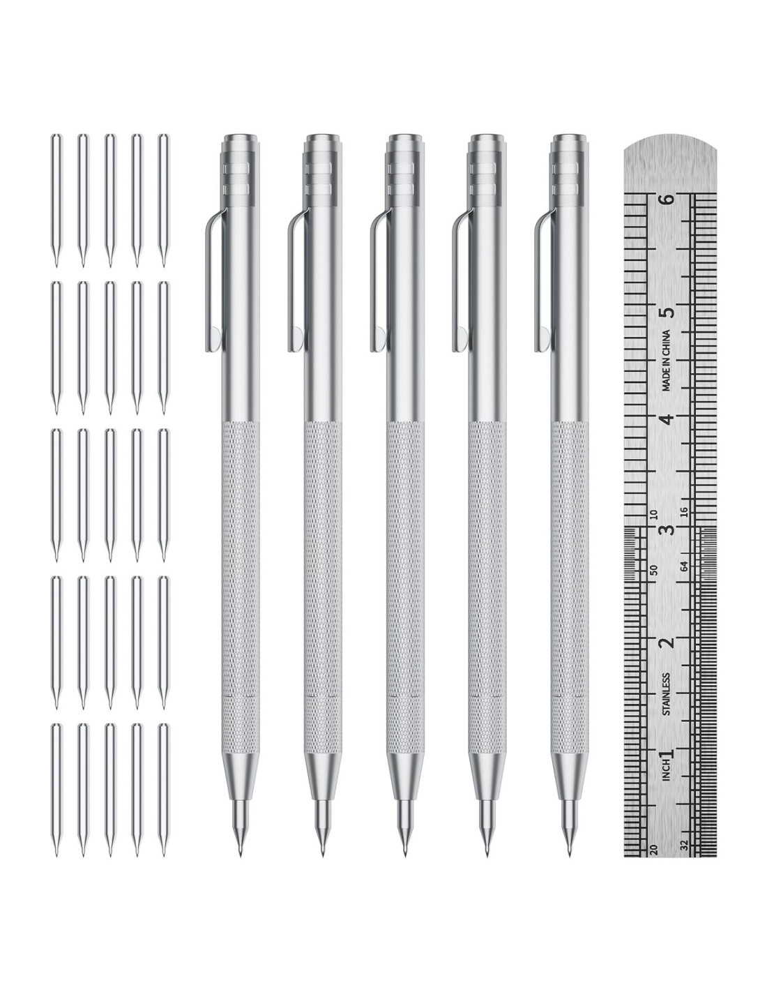 - [Valor a Largo Plazo] Herramienta de marcado con estilete metálico y 25 puntas de repuesto (5 por bolígrafo) extiende la vida útil de la herramienta para múltiples usuarios. La regla compacta ayuda en tareas de medición básicas. El set completo se almacena fácilmente en cajas de herramientas, ideal para trabajadores del metal, joyeros y aficionados al bricolaje que requieren herramientas de marcado confiables.