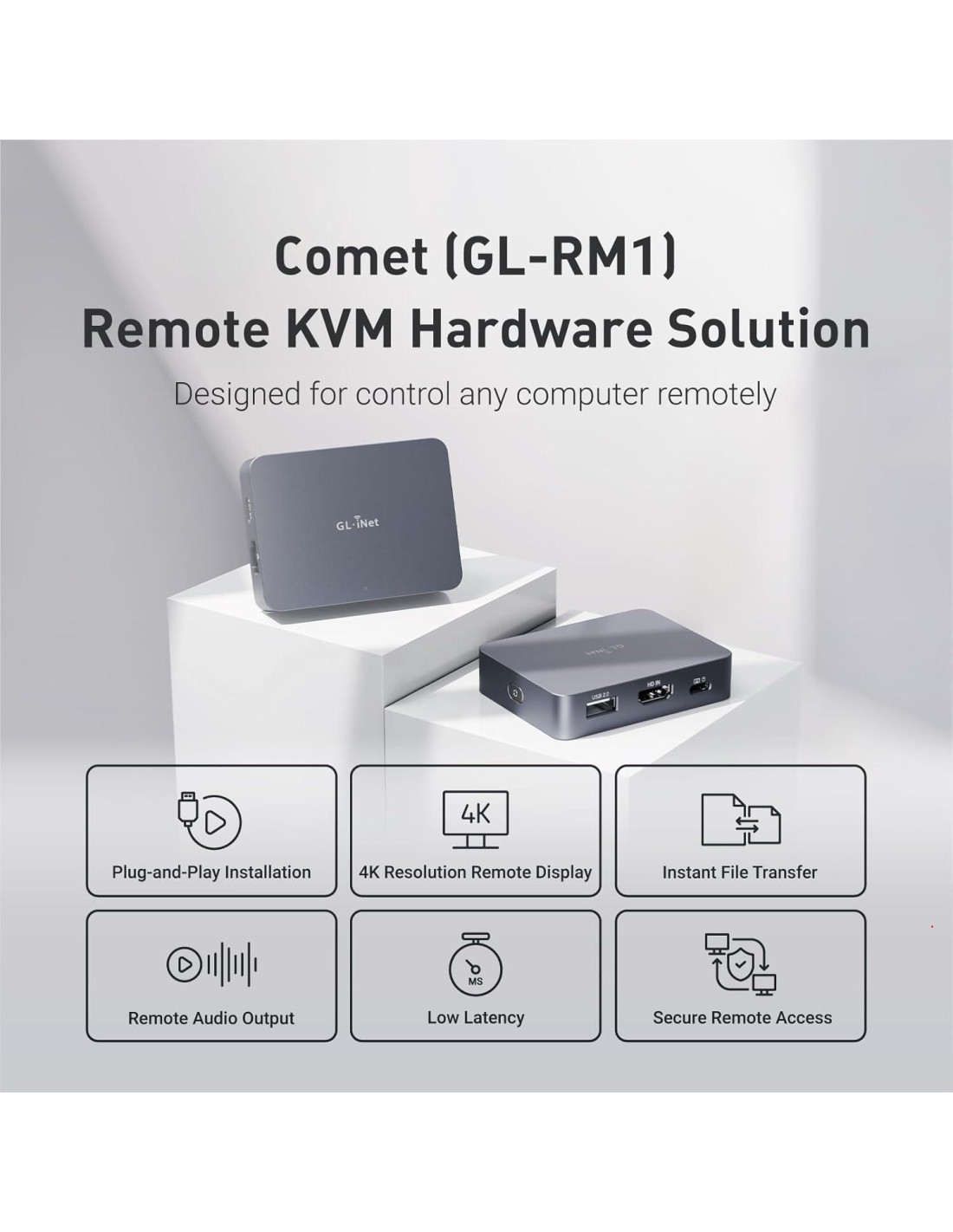 Fundada en 2010, GL.iNet se especializa en hardware y software de redes seguras, ofreciendo enrutadores, puertas de enlace y dispositivos KVM para hogares inteligentes, negocios y despliegues industriales. Junio 2025 - GL.iNet, un líder global en hardware de redes seguras, presenta con orgullo Comet (GL-RM1) - un dispositivo KVM remoto plug-and-play que permite el acceso a sistemas desde cualquier parte del mundo. El KVM de GL.iNet se puede usar para controlar cualquier dispositivo que utilice salida HDMI y entrada USB, como laptops, escritorios, Raspberry Pi, mini servidores, etc. No se requiere instalar software en el dispositivo controlado, y puede ser Windows, macOS, ChromeOS, Linux, etc. En cuanto al dispositivo de control, si se necesita instalar software en él depende de la forma en que desee acceder al dispositivo controlado.