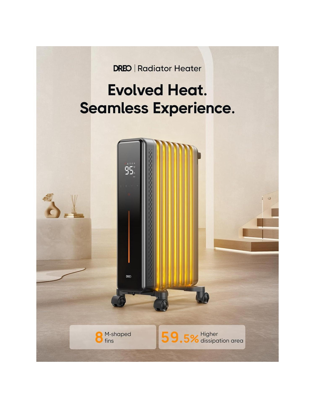 - Calor para toda la habitación de primera categoría: Las ocho aletas en forma de M del radiador de aceite Dreo aseguran una disipación de calor 59.5% más alta para una distribución de calor amplia y uniforme.