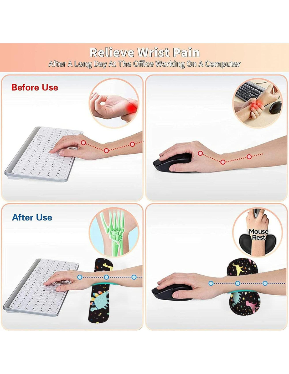 - Diseño de fondo de goma antideslizante - La parte posterior del kit de soporte para muñeca utiliza goma natural texturizada para proporcionar un agarre firme y prevenir deslizamientos. Puedes disfrutar de una operación estable del ratón o teclado durante el trabajo o juegos.
