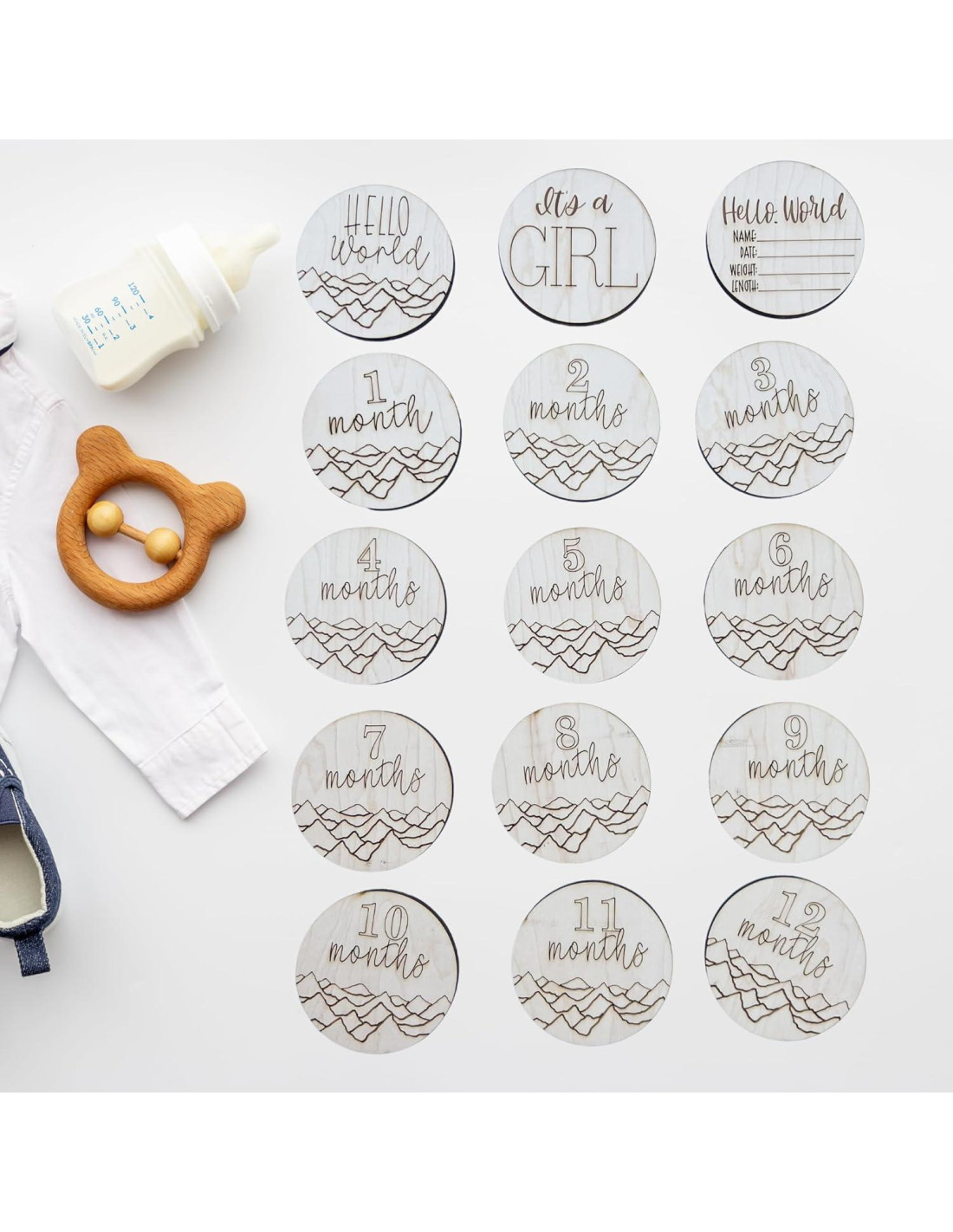 - Conjunto Completo de Hitos Mensuales - Incluye 12 marcadores de hito de madera (1-12 meses) más discos de 'Hola Mundo' y 'Un Año' para fotografía de recién nacidos y bebés.