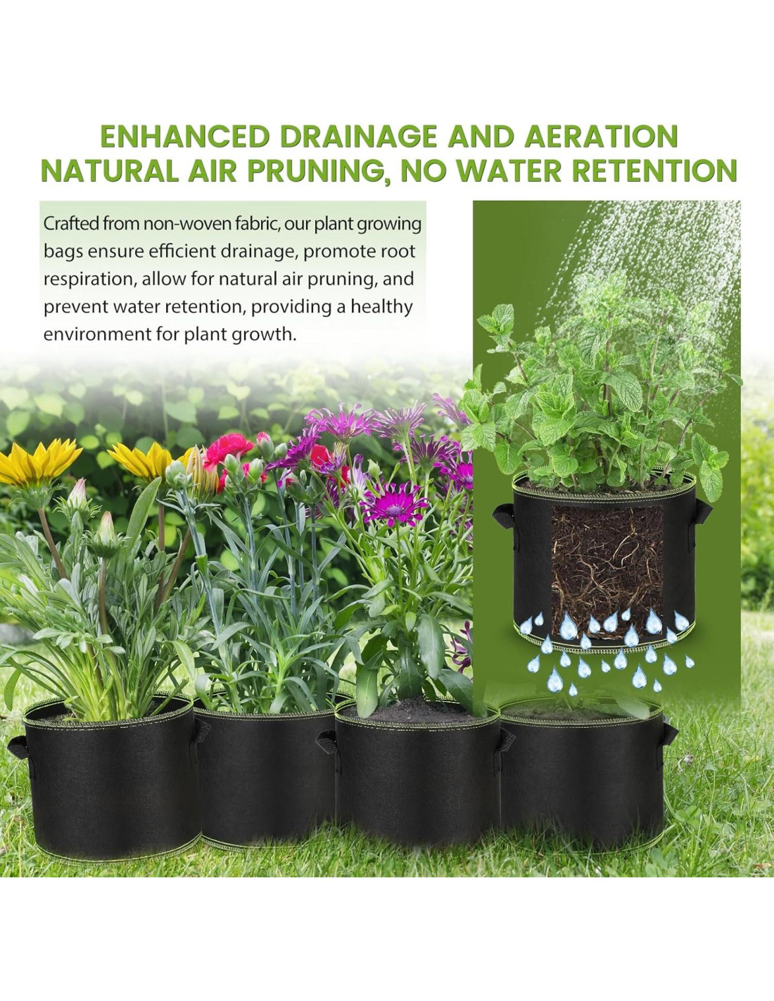 Nuestras bolsas de crecimiento están diseñadas con capacidades de drenaje superiores, permitiendo que el exceso de agua drene de manera natural. Esto previene el encharcamiento y la pudrición de las raíces, asegurando una salud óptima de las raíces y una absorción de nutrientes. La estructura de raíces aireadas evita que las raíces se enrosquen, promoviendo plantas más fuertes y robustas.