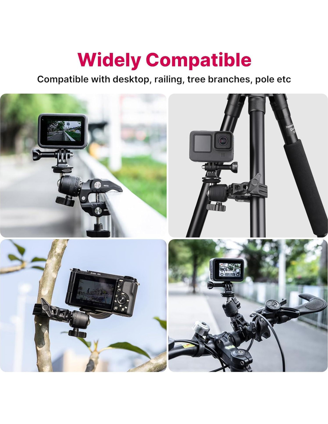 - Cabezal de bola con rotación de 360, puedes ajustarlo a cualquier ángulo que necesites, se bloquea rápidamente con la perilla, con tornillo de 1/4", adecuado para monitor, cámara de acción, DSLR, luces LED, micrófonos, flash, etc.
