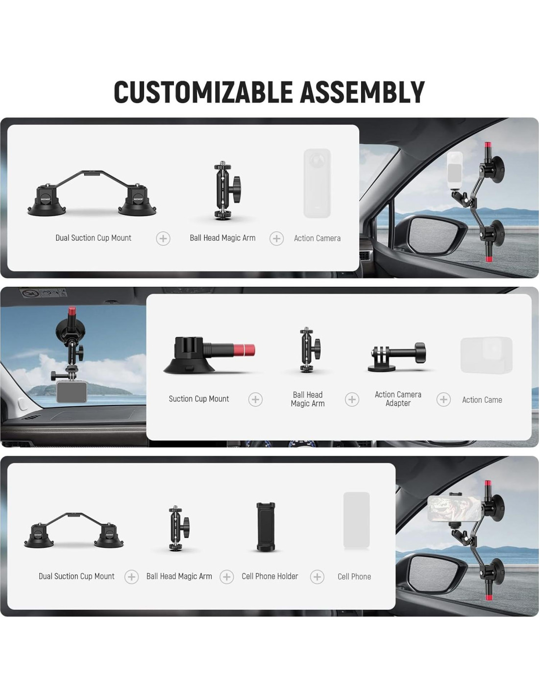 - [Kit de Soporte de Ventosa Doble para Coche] Captura ángulos de conducción únicos desde el capó de tu motor, parabrisas interior/exterior, tablero o lado del coche para una inmersiva grabación en primera persona en la carretera. Este soporte de ventosa para coche sujeta de forma segura tu cámara de acción o smartphone con dos potentes ventosas, y lo posiciona a través del brazo mágico de doble cabezal de bola para diversas perspectivas de grabación de video. También incluye un adaptador para cámara de acción y un soporte de teléfono ajustable para una configuración sin complicaciones, y una correa para mayor seguridad.