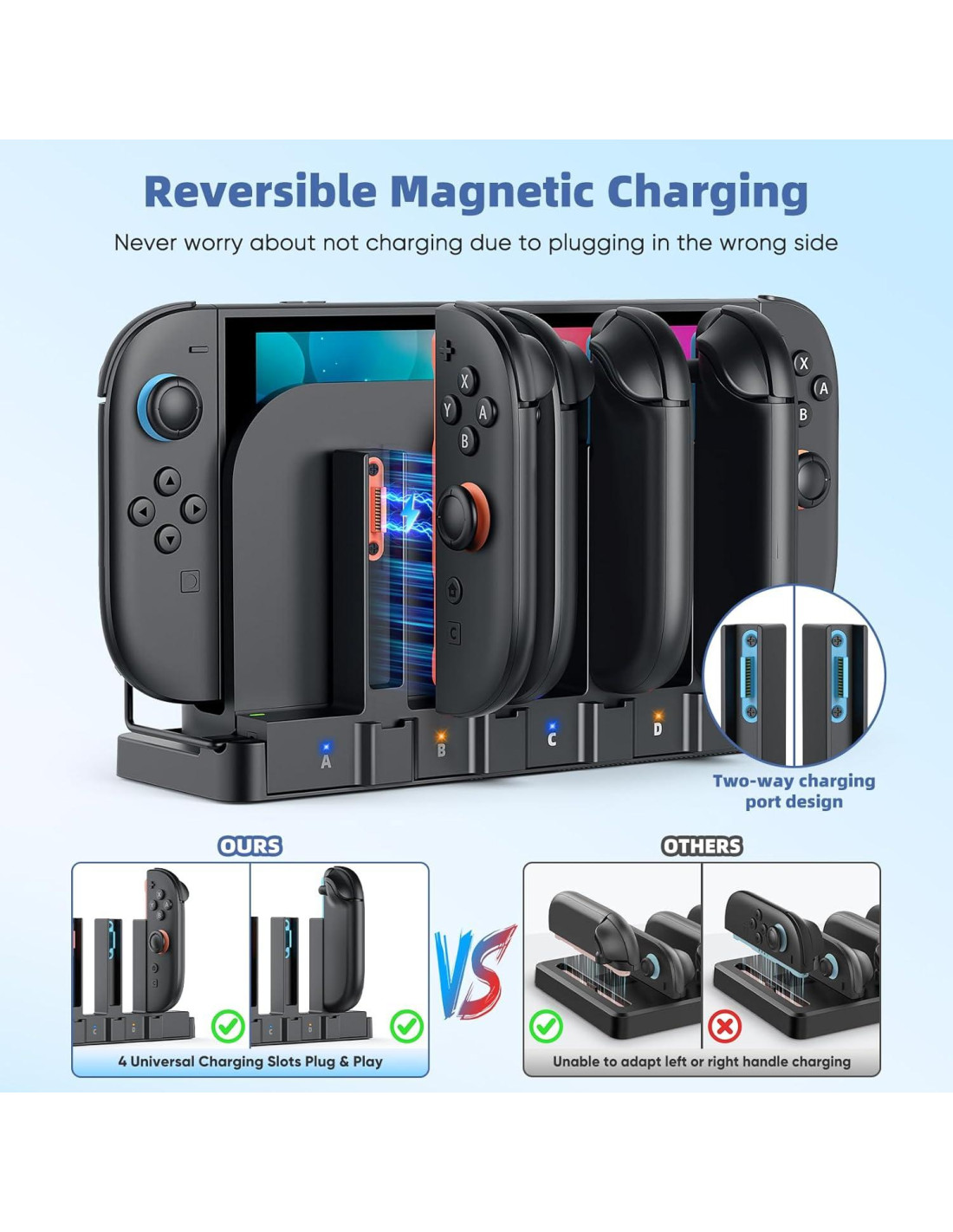 - Base de Carga Magnética Bidireccional para Switch 2: ¡No más inserciones del lado incorrecto! Los 4 slots de cargador magnético dedicados para joy cons de nintendo switch 2 soportan carga bidireccional, eliminando errores de carga para una carga sin esfuerzo. Los accesorios perfectos para nintendo switch 2 para extender tu tiempo de juego en switch