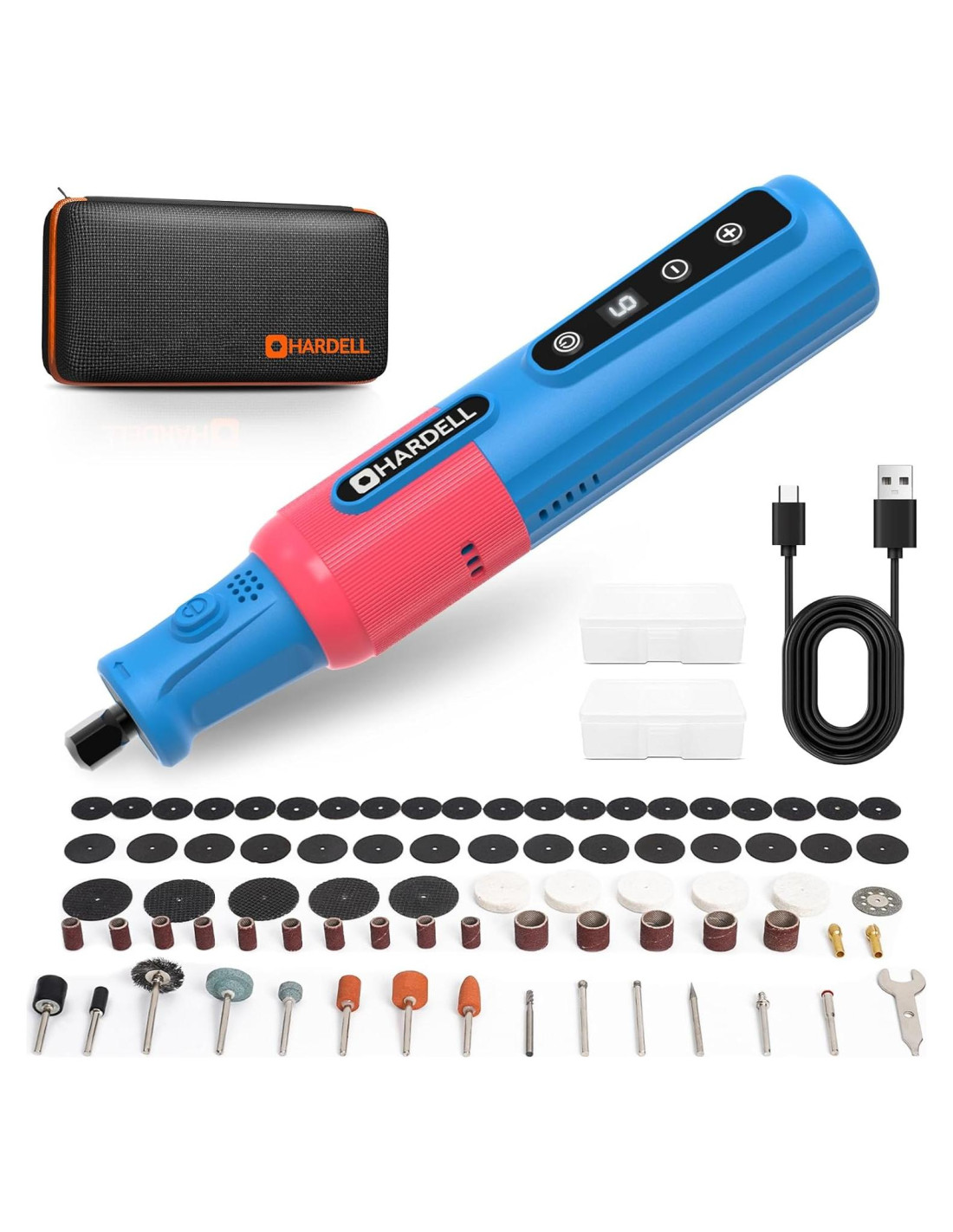 1. Especificaciones Técnicas Voltaje: 8V Batería de Litio Recargable (3H de Tiempo de Ejecución) Velocidad: 6 Velocidades Ajustables (5,000-30,000 RPM) Cargador: Cable USB-C Incluido Peso: 0.8lbs (0.36 kg) (Empuñadura Ergonómica Antideslizante) Compatibilidad: Madera/Metal/Plástico/Vidrio/Cerámica 2. Lista Completa de Accesorios Corte y Tallado 15 Ruedas de Corte Estándar, 5 Discos de Corte de Malla, 1 Disco de Corte de Diamante Lijado y Pulido 20 Bandas de Lijado, 5 Ruedas de Pulido de Lana, 2 Molinos de Carburo de Silicio Perforación y Grabado 3 Puntas de Diamante, 1 Cortador de Fresadora de Columna, 1 Broca de Twist Herramientas Esenciales 3.2mm Chuck, Llave, Bolsa de Almacenamiento de Lona 3. ¿Por qué elegir HARDELL? Rendimiento de Grado Profesional Diseñado para carpinteros/joyeros/DIYers que necesitan precisión y durabilidad. Batería de Litio más Segura Batería certificada por UL con protección contra sobrecarga/sobrecalentamiento. Soporte de 5 Años Contáctenos en cualquier momento para piezas de repuesto o orientación técnica.