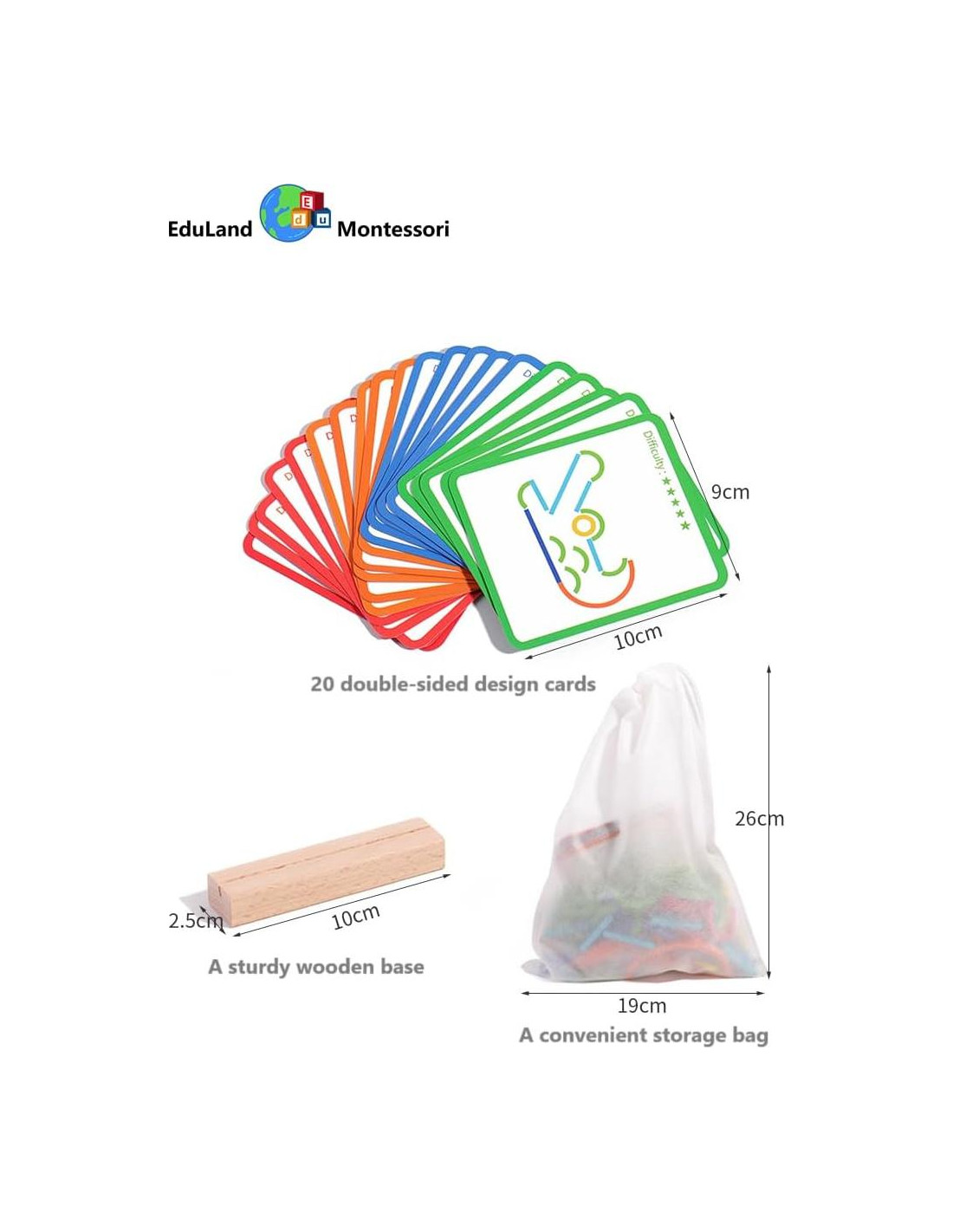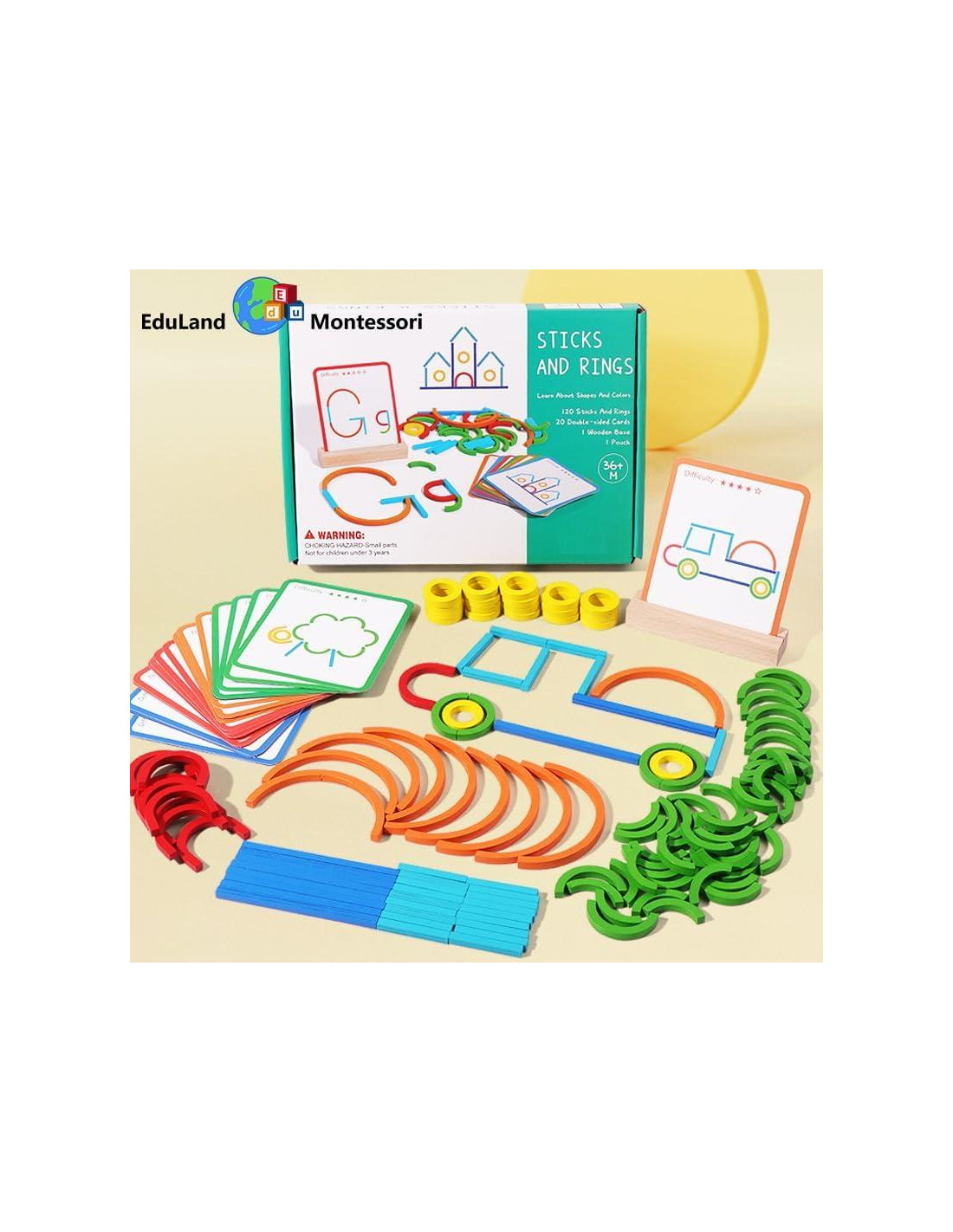 - Juego Creativo: Incluye 120 palos y anillos coloridos, 20 tarjetas de diseño de doble cara, una base de madera y una bolsa de almacenamiento para diversión de construcción sin fin.